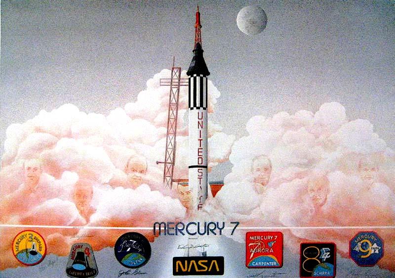 Limited edition lithograph, entitled ''Mercury 7'' signed by six of the seven Mercury astronauts, four of whom have since passed away. Signed by D.K. ''Deke'' Slayton, Alan Shepard, Gordon ''Gordo'' Cooper, Walter ''Wally'' Schirra, John Glenn and Scott Carpenter. This large lithograph, #686 of 1,500 prints by artist George Bishop, was conceived 22 years ago to raise seed money for the Mercury Foundation. Measures 35'' x 25'' in near fine condition.