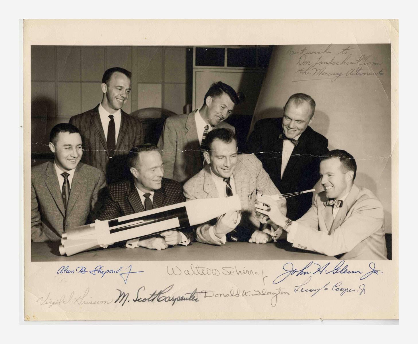 Unique Mercury 7 signed photo, rarely encountered as signed by all seven, including Virgil ''Gus'' Grissom. Photo features the seven men posing in a jovial manner with a model spaceship. Signed on the border below the photo, underneath their respective images, ''Alan B. Shepard Jr.'', ''Walter W. Schirra Jr.'', John A. Glenn, Jr.'', ''Virgin I. Grissom'', ''M. Scott Carpenter'', ''Donald K. Slayton'' and ''Leroy G. cooper, Jr.''. Inscribed in the upper right corner, likely by Grissom, ''Best wishes to Don Landschout from the Mercury Astronauts''. 10'' x 8'' matte photo has one horizontal crease through center and lighter creasing to corners. Overall very good condition.