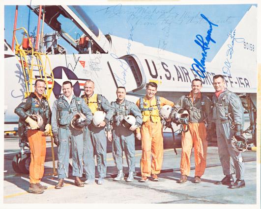 Mercury 7 group photo signed by all original seven astronauts, the first men chosen in April 1959 to venture into space. 10'' x 8'' color photo features the astronauts in their flight suits in front of an Air Force F-102, with all signing above their respective images in various inks, from left to right: ''Scott Carpenter'', ''Gordon Cooper'', ''J H Glenn Jr'', ''Gus Grissom'', ''W M Schirra'', ''Alan Shepard'' and ''D K Slayton''. Inscribed at top by one of the astronauts, ''To Jerry Michaud with Best Wishes from the 7 Astronauts''. It is interesting to note that Carpenter, Cooper and Shepard have signed (obviously at a later date) over their original authentic, but very light, signatures: ''Scott Carpenter'', ''Gordon Cooper'', and ''Alan B Shepard Jr''. A cornerstone piece for any space collection. Fine condition except for light tape stains only affecting borders.