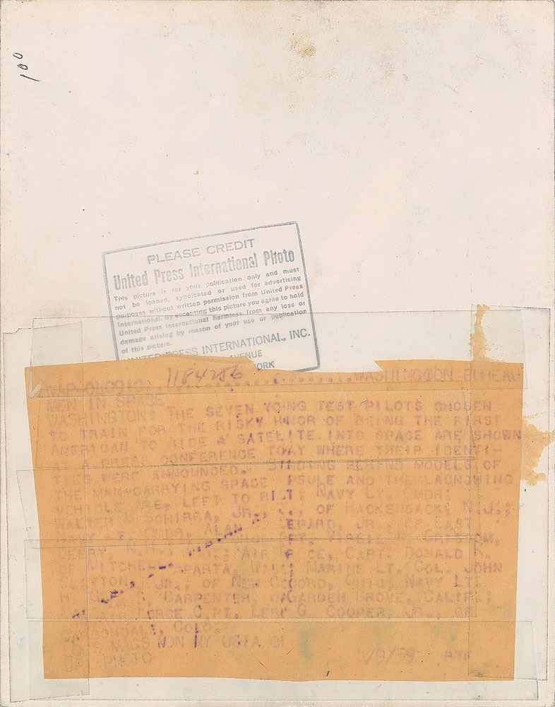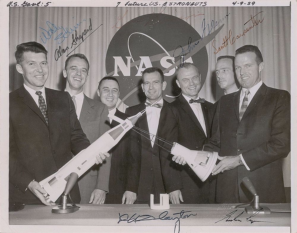 Remarkable vintage glossy 9 x 7 black and white photo of the Mercury 7 posing with rocket and capsule models during their introductory press conference on April 9, 1959, signed in various ink types, "Wally Schirra," "Alan Shepard," "Gus Grissom," "D. K. Slayton," "John Glenn," "Scott Carpenter," and "Gordon Cooper." Upper border of photo annotated by an unknown hand in black ink, "U. S. Govt: 5, 7 Future US. Astronauts, 4–9–59." Reverse bears an affixed press caption and an United Press International Photo credit stamp. In fine condition, with mild rippling and fading to Grissom's signature. Only six months after NASA's birth, the agency introduced its first class of astronauts: the Mercury Seven. Held in Washington in early April 1959, the press conference introduced the world to a group of men who would become household names and genuine American heroes. Six of the original seven flew missions for the Mercury program, with the lone exception being Deke Slayton, who was diagnosed in 1962 with an erratic heart rhythm and grounded from flight by NASA and the Air Force; he made his spaceflight debut when he served as the docking module pilot for the historic Apollo–Soyuz test Project in 1975. The Mercury flights not only proved that humans could live and work in space, but paved the way for the Gemini and Apollo programs as well as for all further human spaceflight. A sensational, fully signed photo representing the day the world first learned of the Mercury 7.