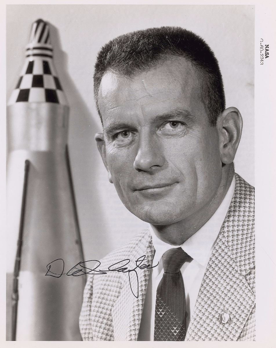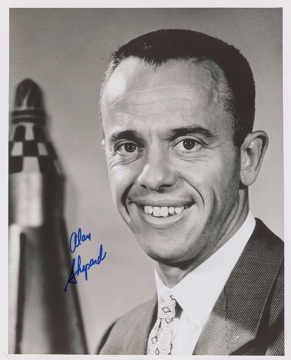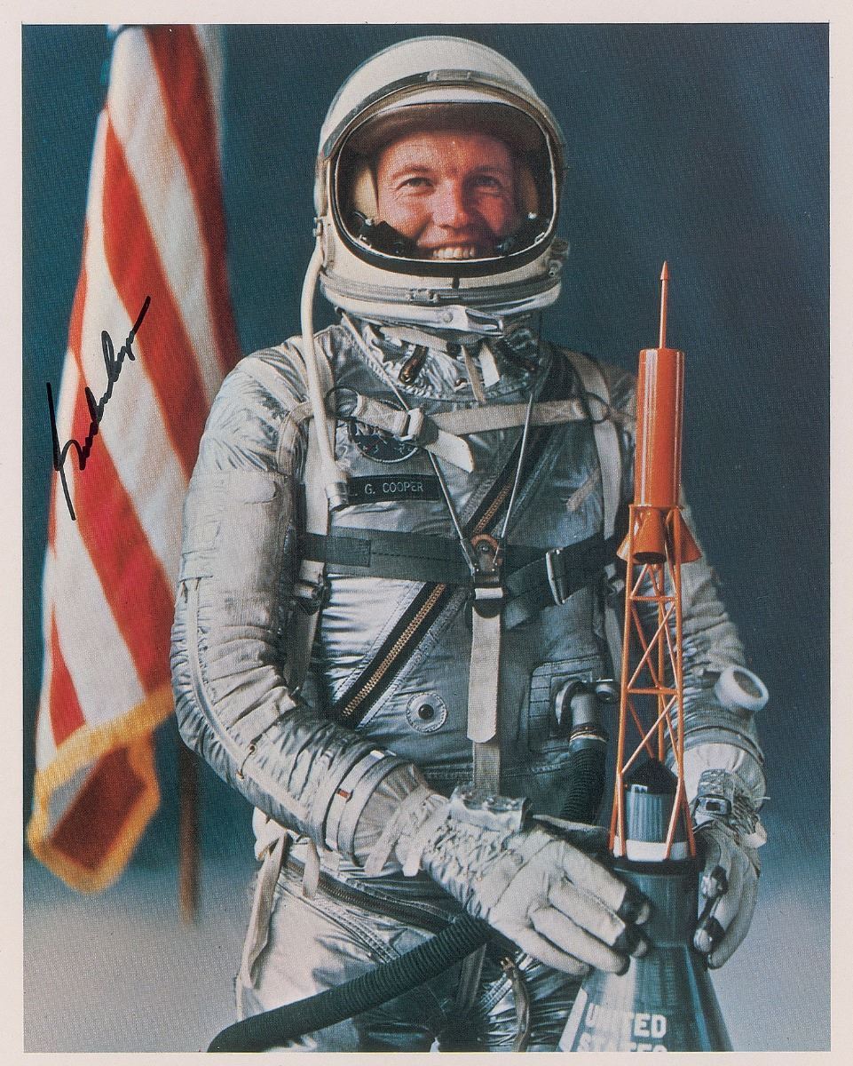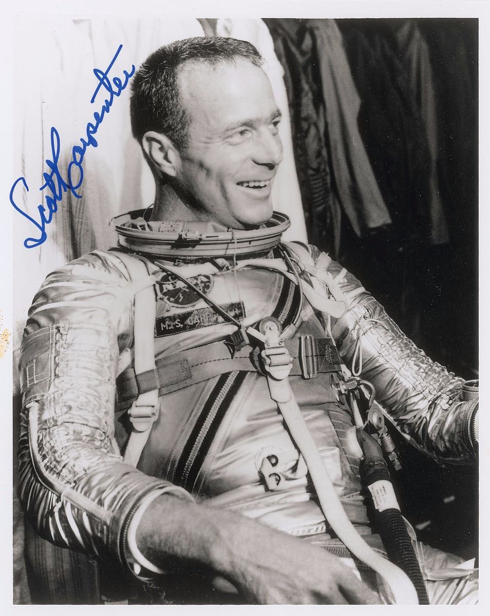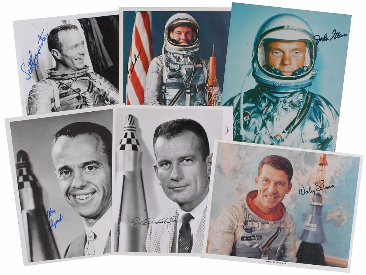 Wonderful collection of six of the seven Mercury astronauts, 8 x 10 and 10 x 8, each signing in ink and felt tip, including: Wally Schirra, John Glenn, Alan Shepard, Deke Slayton, Scott Carpenter, and Gordon Cooper. In overall fine condition, with a small area of soiling to border of Carpenter photo. The Leon Ford Collection.