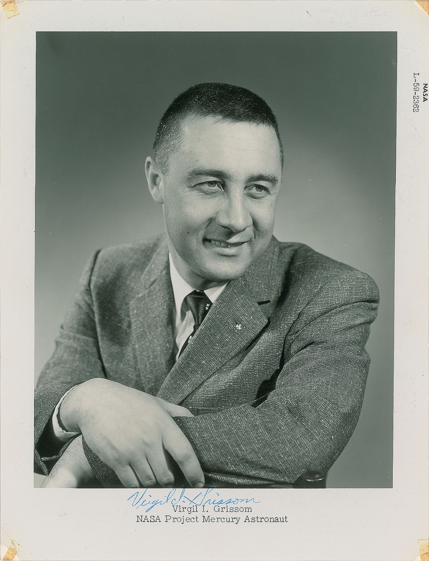 Outstanding complete set of vintage official glossy 8 x 10 black-numbered NASA photos of the Mercury 7 astronauts, each signed neatly in blue ballpoint: "Virgil I. Grissom," "Leroy G. Cooper, Jr.," "Walter M. Schirra, Jr.," "Alan B. Shepard, Jr.," "Donald K. Slayton," "M. Scott Carpenter," and "Best wishes—John H. Glenn, Jr., Mercury Astronaut." In overall very good to fine condition, with creasing and tape stains to the corners, and surface impressions from Glenn's inscription, which has been evidently erased. As individual lots, these uninscribed NASA portraits are seldom seen and extremely desirable; as a full compilation, this group lot represents a unique opportunity to own matching vintage photos signed by each of America's original seven astronauts. A simply remarkable assemblage.