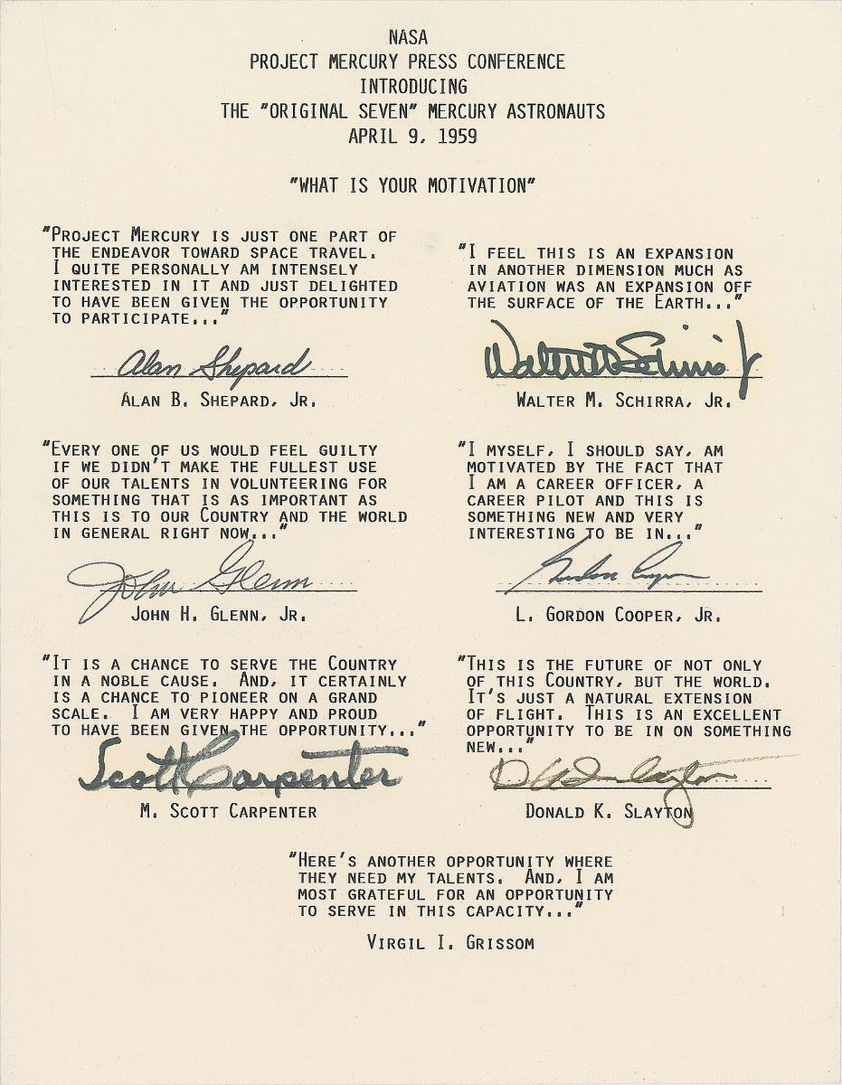 Souvenir typescript, one page, 8.5 x 11, signed in black felt tip and ballpoint by Alan Shepard, Wally Schirra, John Glenn, Gordon Cooper, Scott Carpenter, and Deke Slayton. An interesting typescript containing each of the astronauts’ responses to the question “What is your motivation?,” at the press conference introducing the original seven astronauts. In fine condition, with some haloing to signatures. An unusual format lending insight into each of the astronauts’ thought processes as they prepared to attempt manned spaceflight for the first time. From the collection of aerospace memorabilia specialist Ken Havekotte.