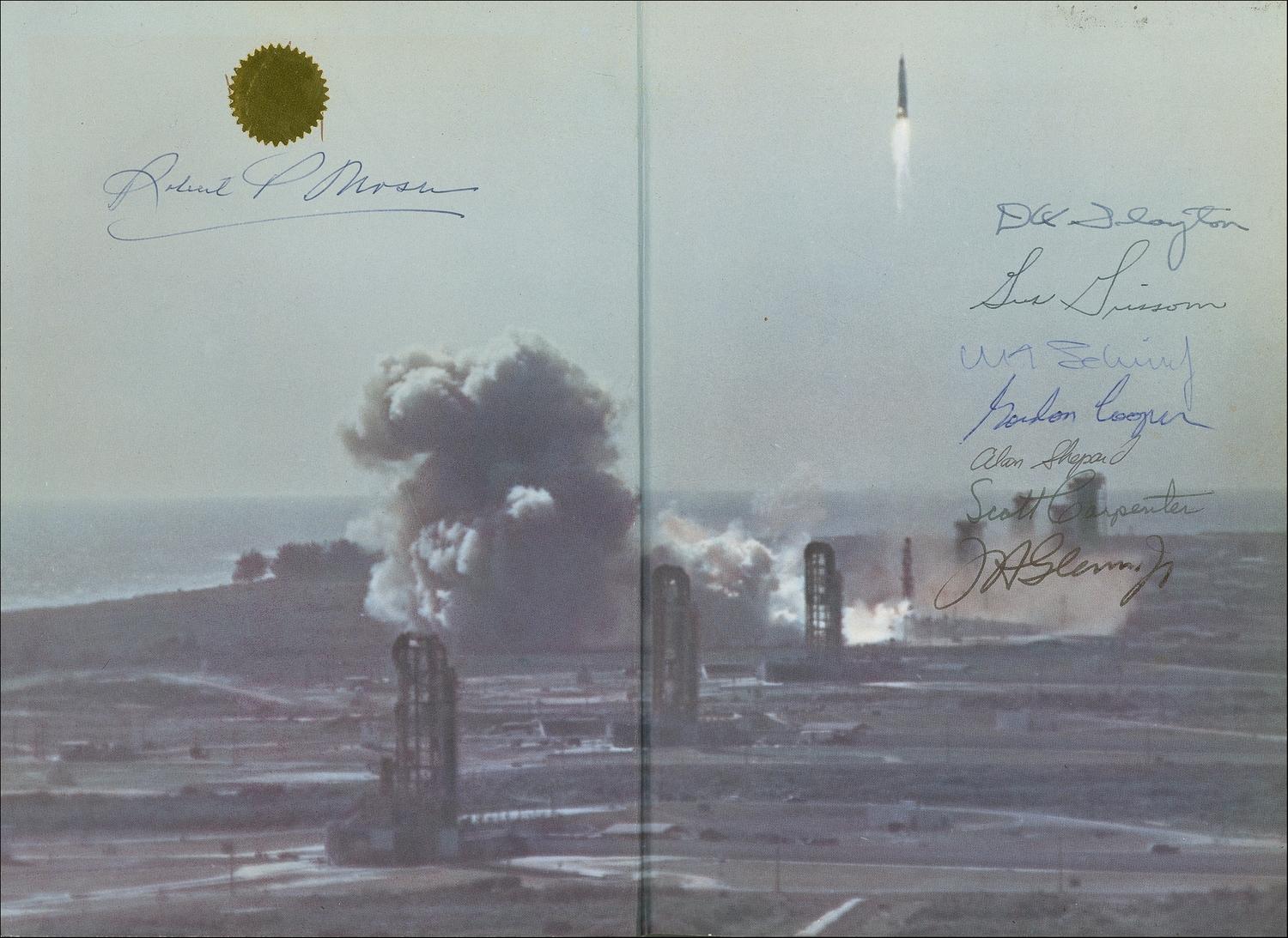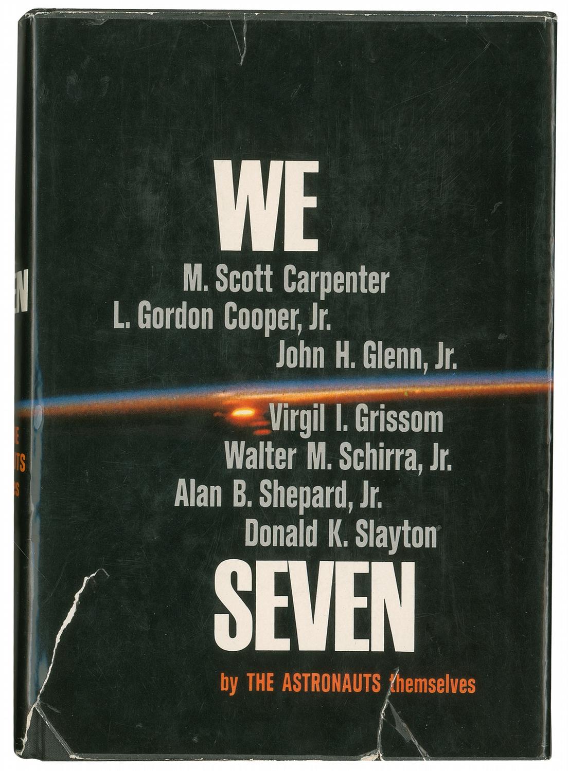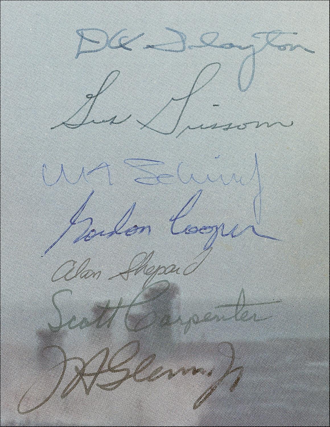 Signed book: We Seven. First edition, first printing. NY: Simon and Schuster, 1962. Hardcover with dustjacket, 6.75 x 9.5, 352 pages. Signed in ink and felt tip on the first free end page by five of the seven: “W. M. Schirra, Jr.,” “Gordon Cooper,” “Alan Shepard,” “Scott Carpenter,” and “J. H. Glenn, Jr.” The page also bears autopen signatures of Grissom and Slayton. The book also has an owner’s signature to inside front cover, as well as eight commemorative postage stamps and owner’s bookplate affixed to second free end page. In very good condition, with light front hinge separation, spine a bit weak, and a bit of trivial soiling along top edge of signed page. Dustjacket has several noticeable tears, scattered surface impressions, light soiling, and a price clip inside.