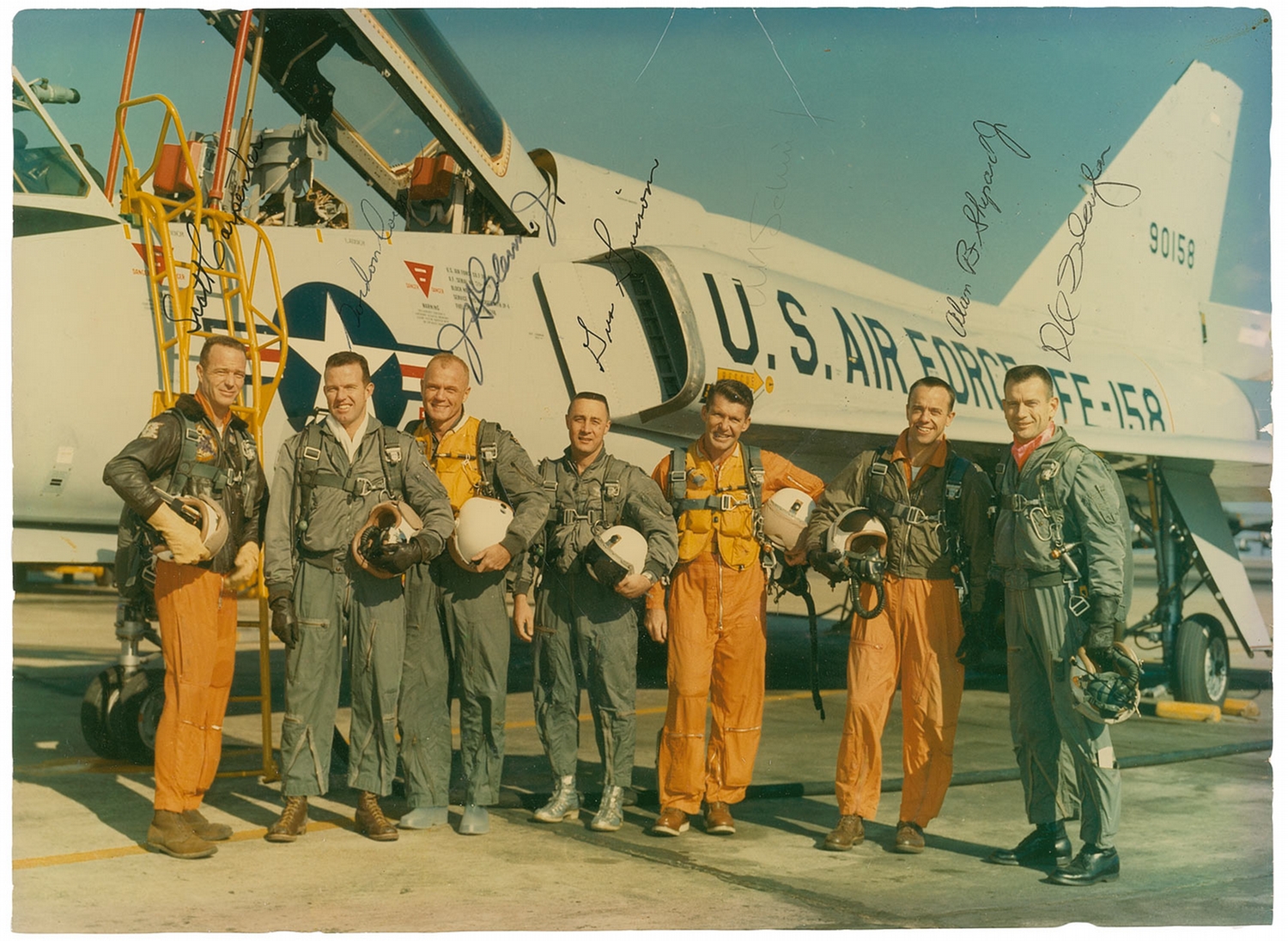 Color satin-finish 14 x 10 photo of all seven Mercury astronauts in their flight gear with a jet in the background, signed vertcally in ink, “Scott Carpenter,” “Gordon Cooper,” “J. H. Glenn, Jr.,” “Gus Grissom,” “W. M. Schirra, Jr.,” “Alan B. Shepard, Jr.,” and “D. K. Slayton.” Schirra’s signature has faded over time and is difficult to distinguish. In very good condition, with rippling, scattered creasing and light staining, scattered spots of soiling, a few spots of edge chipping, and surface marks with a diagonal mark crossing the center of the page and passing through Shepard’s name. Accompanied by a letter of provenance from the original owner who explains that she was employed at Cape Canaveral in the early 1960s and was friends with many of the astronauts, affording her the opportunity to get the image signed—which they did with their much-less-common ‘formal’ autographs.