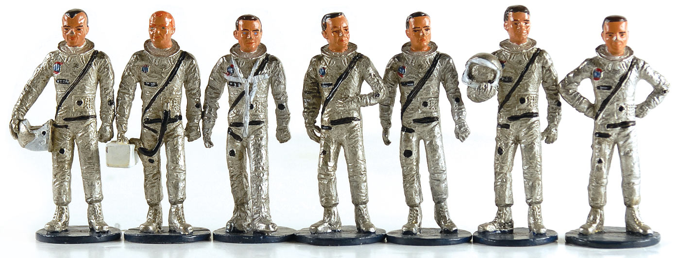 Seven hand-painted lead figurines depicting the original Mercury 7 astronauts in their spacesuits, two of them holding their helmets, each 2.5? high, made by Maranatha Miniatures for the Mercury 7 Foundation in 1991. Accompanied by the original descriptive brochure.
