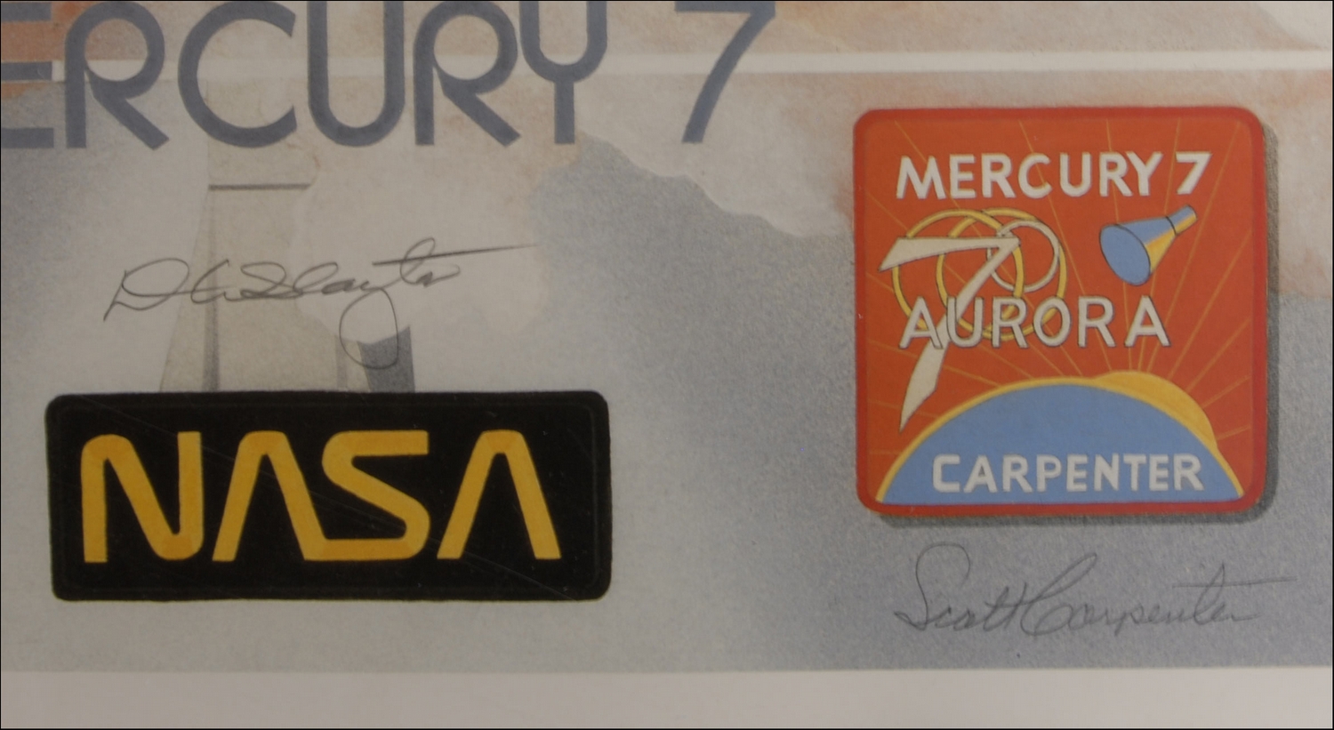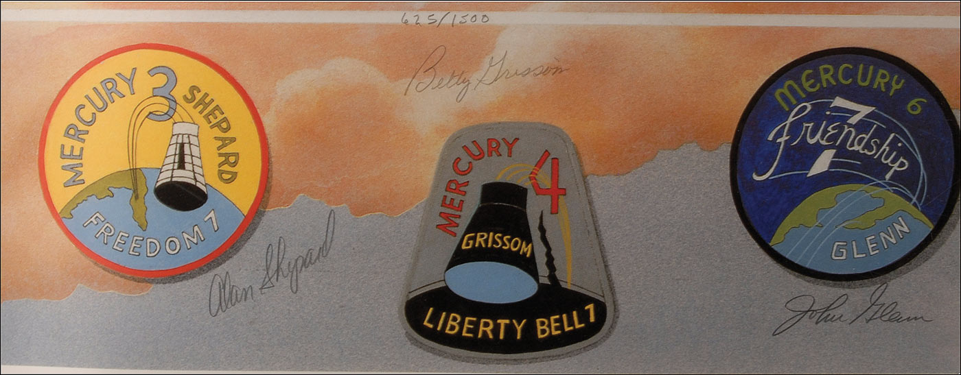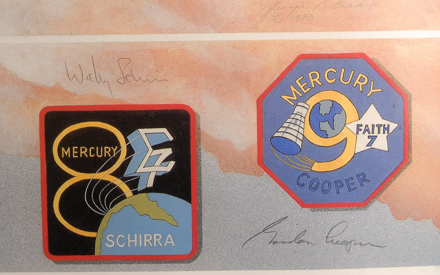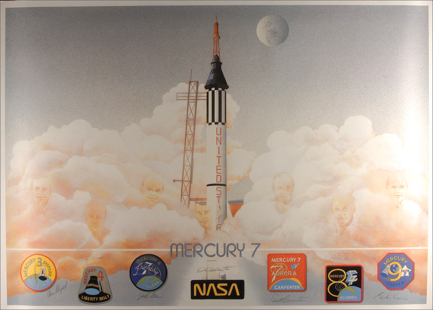 Fabulous color limited edition 35 x 25 print commemorating the Mercury space missions, numbered #625/1500, signed in pencil by Alan Shepard, Betty [Mrs. Gus] Grissom, John Glenn, Deke Slayton, Scott Carpenter, Wally Schirra, and Gordon Cooper. Rolled and in fine condition. Print was published to inaugurate and finance the Mercury Seven Foundation, established in 1984 by the six surviving members of America's original Mercury Seven astronauts. The first seven scholarships, at $1,000 each, were awarded in 1986. As more money was raised the amount and number of scholarships increased gradually. To date, the foundation has awarded nearly $3 million in scholarships to deserving students nationwide.