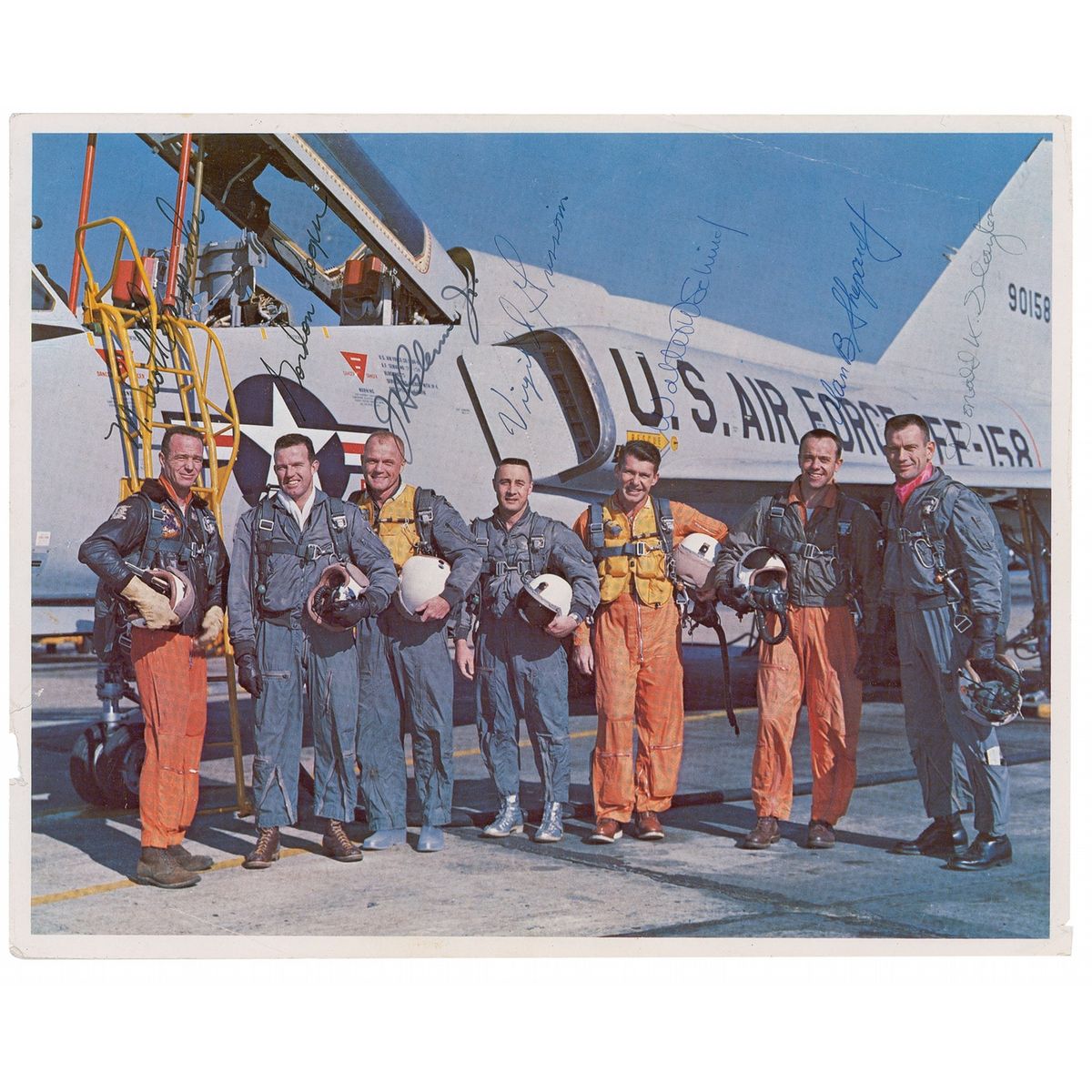 Famous color 10 x 8 NASA photo of the entire Mercury 7 crew posing by an aircraft, signed vertically in ink by “M. Scott Carpenter,” “Gordon Cooper,” “J. H. Glenn, Jr.,” “Virgil I. Grissom,” “Walter M. Schirra,” “Alan B. Shepard,” and “Donald K. Slayton.” In very good condition, with some light surface creasing, a crease to the bottom left and top right corners, a small area of paper loss and a tear to the left edge, a small tear to the bottom right edge, and light contrast to Carpenter’s signature. A quintessential pose, this could be the highlight of any astronaut autograph collection.