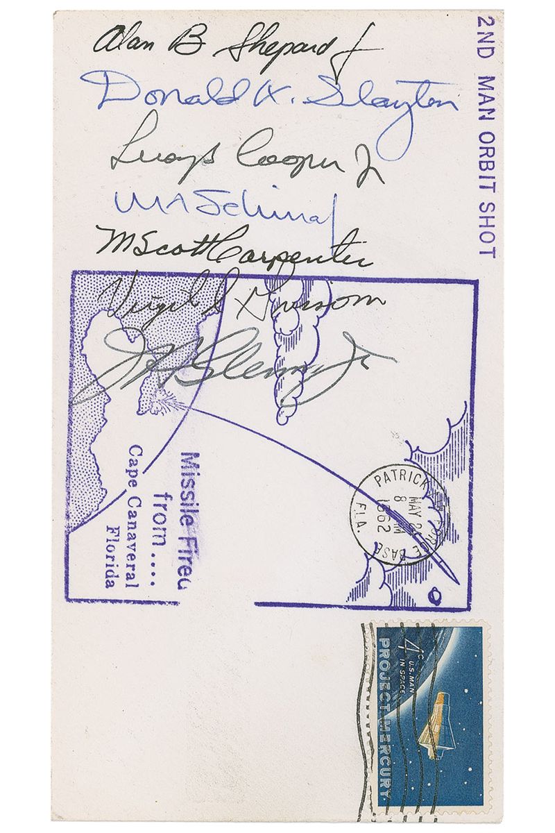 Commemorative cover with a cachet honoring the second man orbit shot of a missile fired from Cape Canaveral, signed vertically in blue and black ink, “Alan B. Shepard, Jr.,” “Donald K. Slayton,” “Leroy S. Cooper, Jr.,” “W. A. Schirra, Jr.,” “M. Scott Carpenter,” “Virgil I. Grissom,” and “J. H. Glenn, Jr.” Cover also bears a May 24, 1962, Patrick Air Force Base postmark. In fine condition.