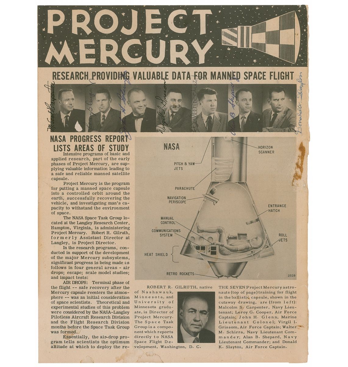 Original 1959 NASA newsletter cover detailing progress on the Mercury program, 8 x 10.5, vertically signed in ink or ballpoint on the cover by all seven original Mercury astronauts, each next to his respective photo, and all signing with their less common ‘formal’ signatures: “M. Scott Carpenter,” “Leroy G. Cooper, Jr.,” “John H. Glenn, Jr.,” “Virgil I. Grissom,” “Walter M. Schirra,Jr.,” “Alan B. Shepard, Jr.,” and “Donald K. Slayton.” The cover also reveals an artist’s rendition of the cramped quarters that awaited the astronauts in their capsule. A bit of light contrast to small portions of a couple of signatures, a central horizontal fold, scattered creasing and toning, dampstaining to edges, a few small edge tears, and some light mounting remnants, otherwise very good condition. Dated April 1959, this newsletter was one of the first introductions of Project Mercury and its seven original astronauts to staff members at Langley Field, Virginia.