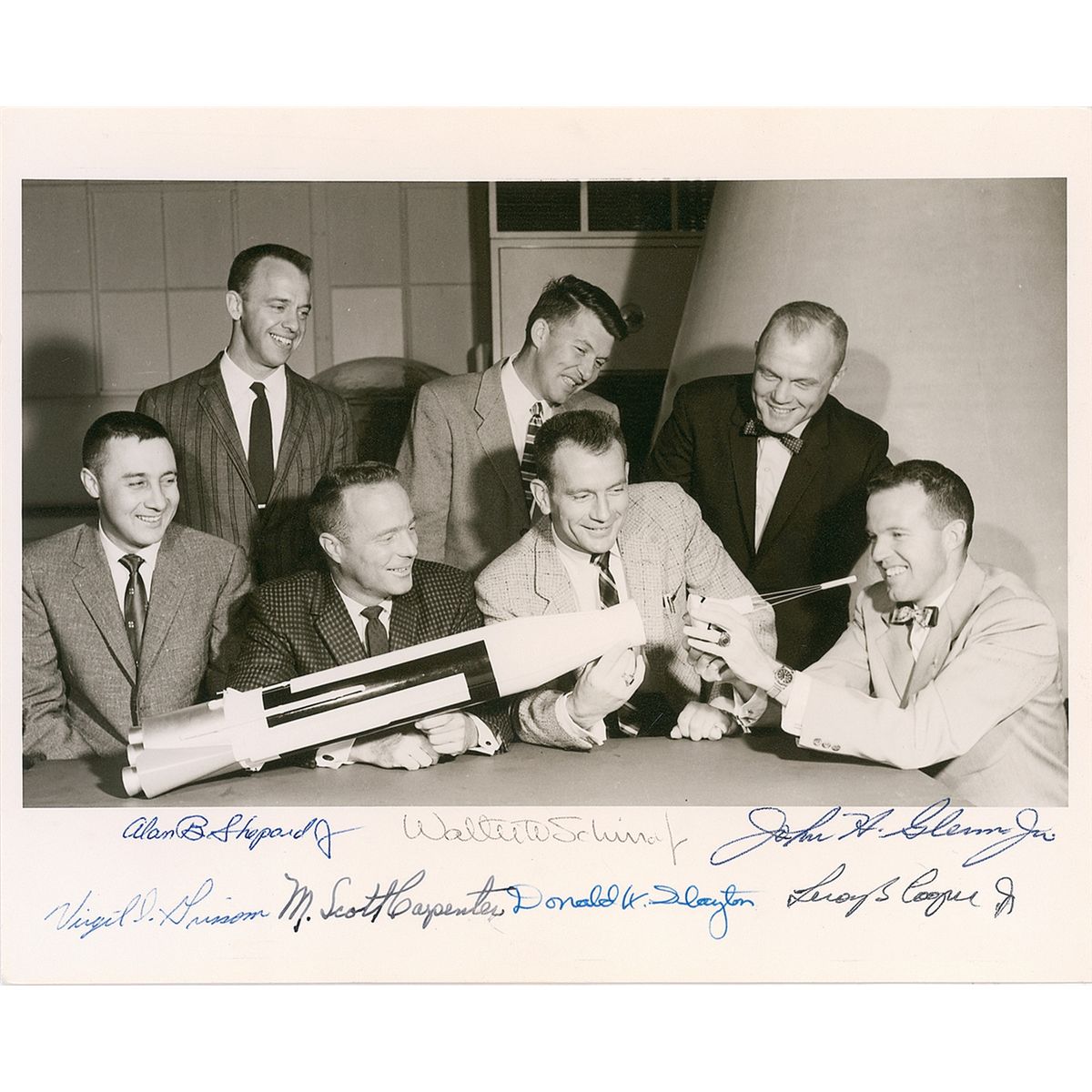 Exceptional vintage matte-finish 10 x 8 photo of the Mercury 7 astronauts with a model of a rocket, signed in various inks “Alan B. Shepard, Jr.,” “Walter M. Schirra, Jr.,” “John H. Glenn, Jr.,” “Virgil I. Grissom,” “M. Scott Carpenter,” “Donald K. Slayton,” and “Leroy S. Cooper, Jr.” In fine condition. A very presentable uninscribed example with the astronauts’ desirable ‘formal’ signatures.