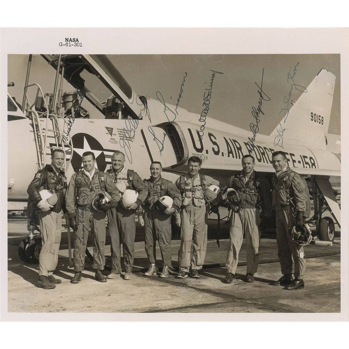 Vintage glossy 10 x 8.5 NASA photo of the Mercury astronauts posing in their flight suits in front of an F-106, signed in black ink “M. Scott Carpenter,” “J. H. Glenn, Jr.,” “Walter M. Schirra,” “Leroy S. Cooper, Jr.,” and “Alan B. Shepard, Jr.” Photo also bears autopen signatures of Gus Grissom and Deke Slayton. In very good condition, with scattered creases, mainly to borders and corners, and mild silvering to darker areas, visible only at an angle.