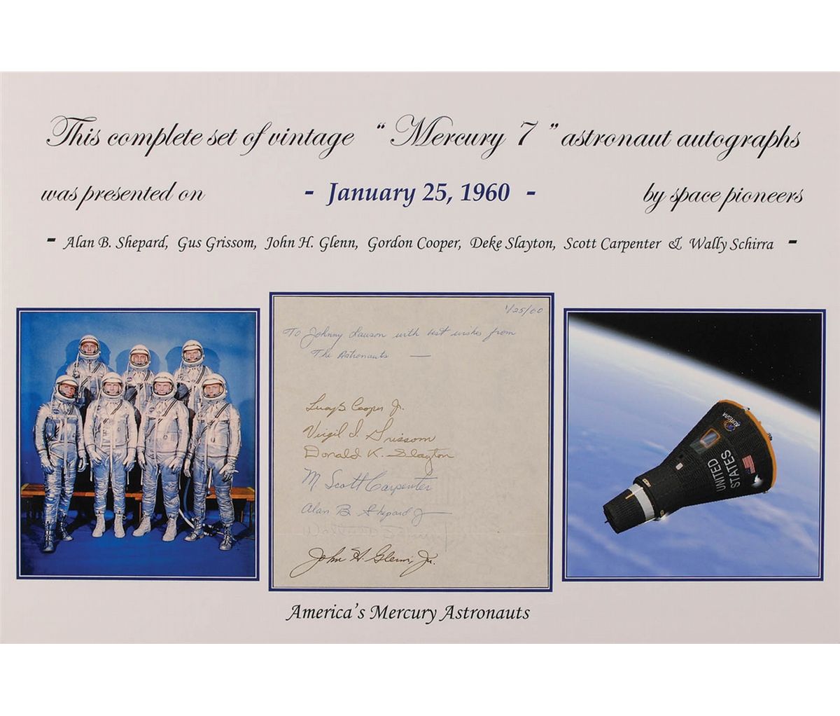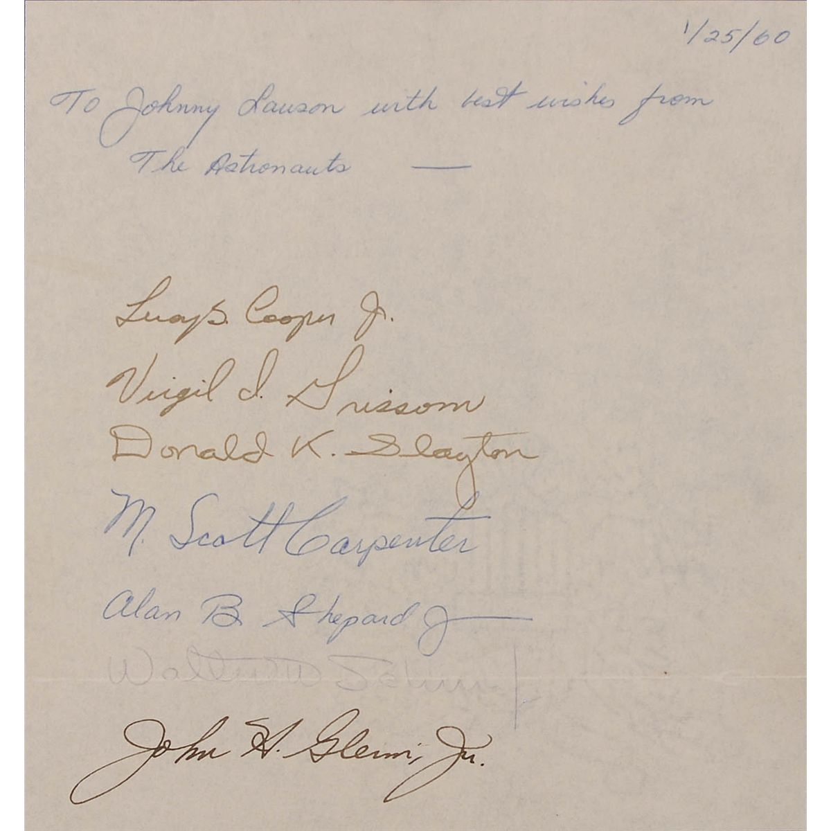 Vintage ink and ballpoint signatures, “Leroy G. Cooper, Jr.,” “Virgil I. Grissom,” “Donald K. Slayton,” “M. Scott Carpenter,” “Alan B. Shepard, Jr.,” “Walter W. Schirra, Jr.,” and “John H. Glenn, Jr.,” on an off-white 6 x 6.5 sheet. Sheet is also inscribed in Alan Shepard’s hand, “To Johnny Lauson, with best wishes from The Astronauts,” and dated January 25, 1960. Affixed to a 19 x 13 foam presentation board with printed images of the astronauts in their flight suits and an artist’s rendition of the Aurora capsule in orbit. In fine condition, with a horizontal fold through Schirra’s signature, which is also a shade light. A highly desirable group of ‘formal’ signatures from NASA’s original astronauts.