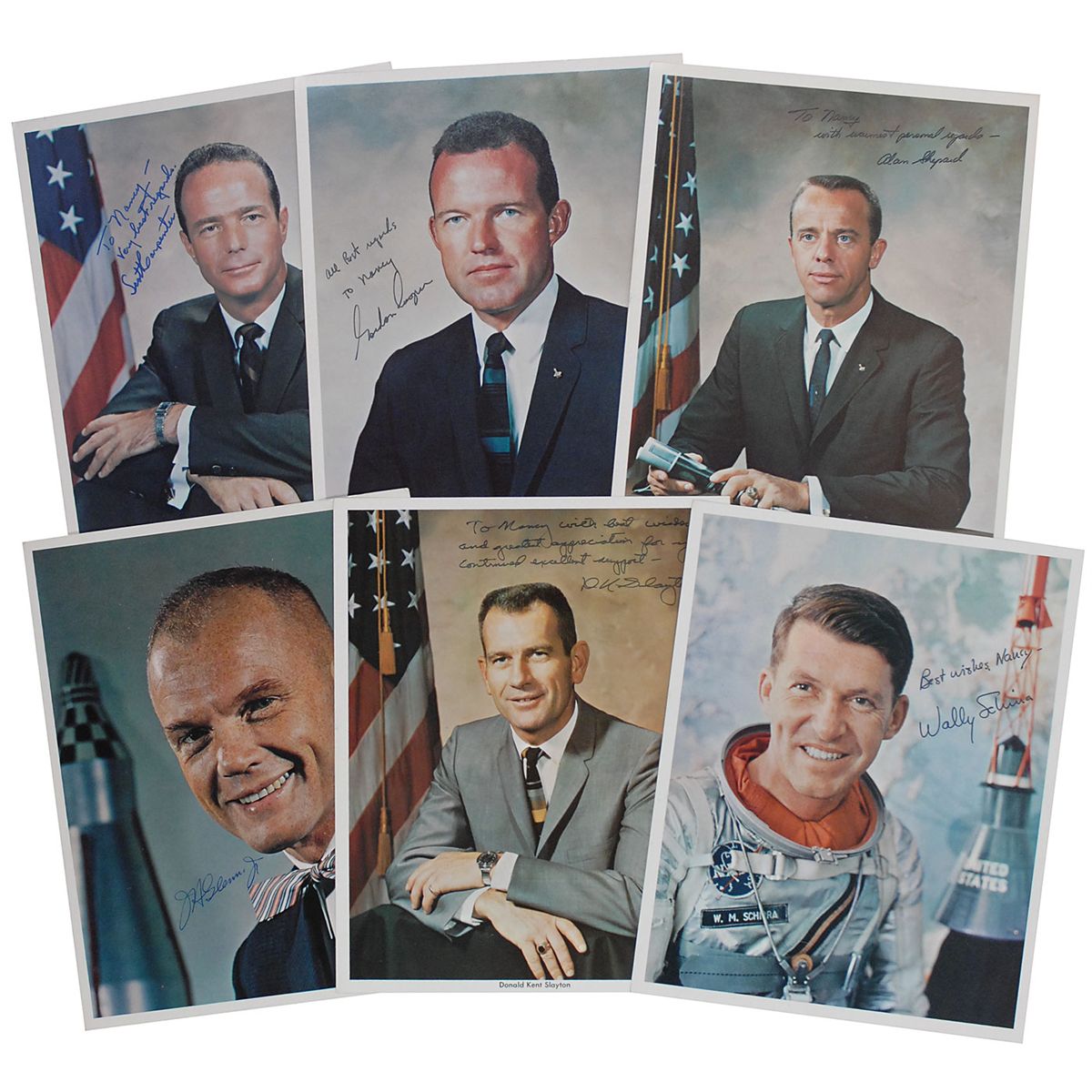 Six color vintage 8 x 10 NASA photos of the Mercury 7 astronauts, each signed in felt tip or ink, most inscribed to “Nancy.” Signers are: Alan Shepard, Deke Slayton, Scott Carpenter, Wally Schirra, John Glenn, and Gordon Cooper. In overall fine condition.