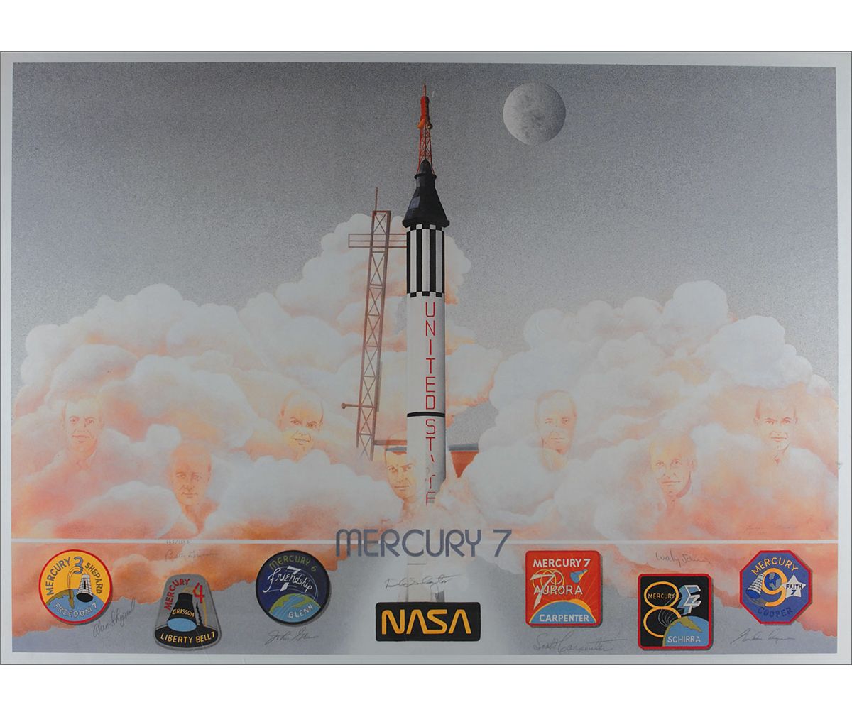 Nostalgic color limited edition 35 x 25 print, numbered #665/1500, featuring an artist’s rendition of the Mercury 7 launch, with portraits of each astronaut interspersed throughout the clouds, signed in pencil by Alan Shepard, John Glenn, Deke Slayton, Scott Carpenter, Wally Schirra, Gordon Cooper, and Gus Grissom’s wife, Betty. Rolled and in fine condition. Print was published to inaugurate and finance the Mercury Seven Foundation, a non-profit national scholarship fund founded by the Mercury astronauts.