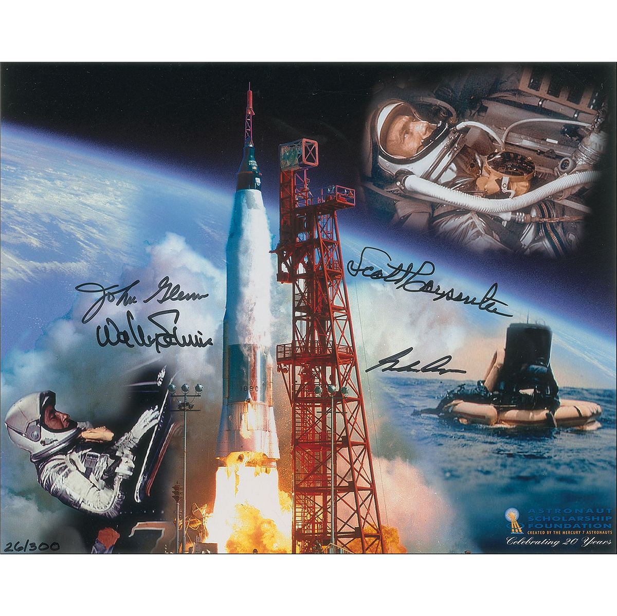 Color limited-edition satin-finish 10 x 8 composite photo, numbered #26/300, signed in black felt tip by Gordon Cooper, Wally Schirra, John Glenn, and Scott Carpenter. In very fine condition. Accompanied by a certificate of authenticity from the Astronaut Scholarship Foundation.