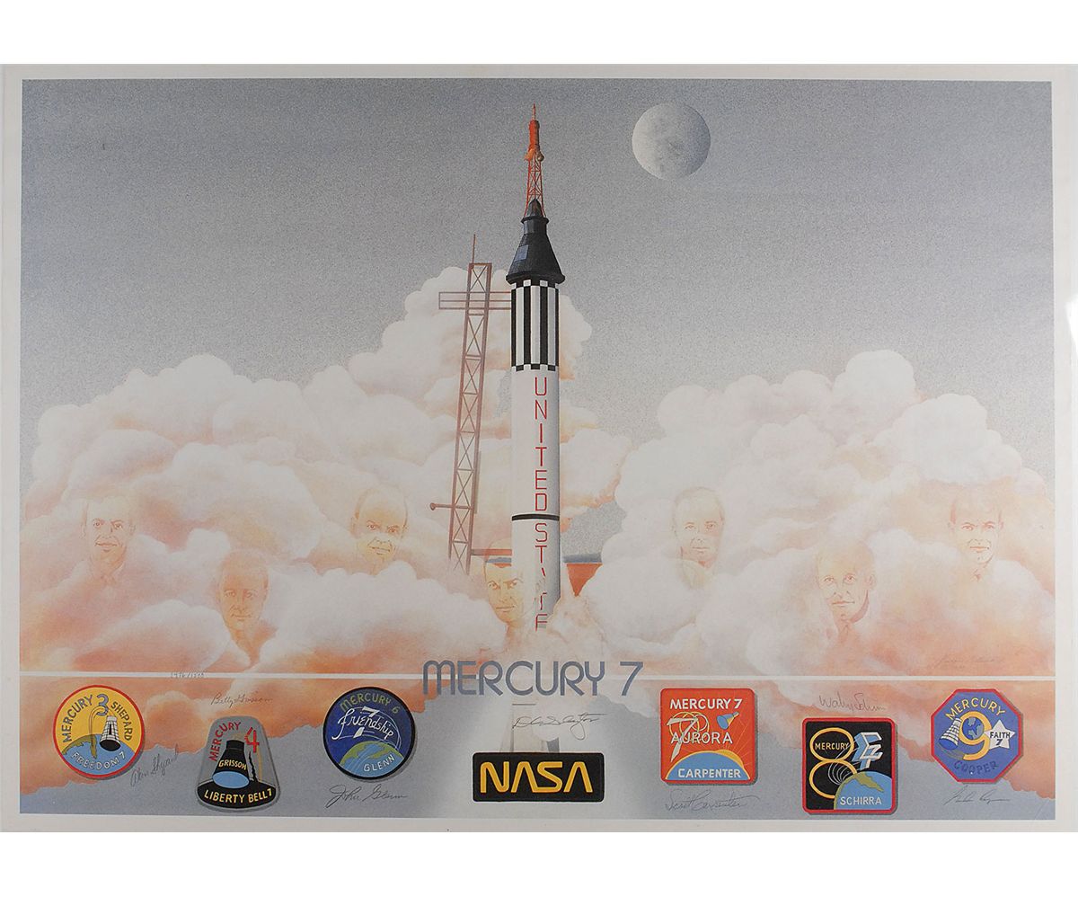 Nostalgic color limited edition 35 x 25 print, numbered 1476/1500, featuring an artist’s rendition of the Mercury 7 launch, with portraits of each astronaut interspersed throughout the clouds, signed in pencil by Alan Shepard, John Glenn, Deke Slayton, Scott Carpenter, Wally Schirra, Gordon Cooper, and Gus Grissom’s wife, Betty. Scattered horizontal bends, otherwise fine condition. Rolled.