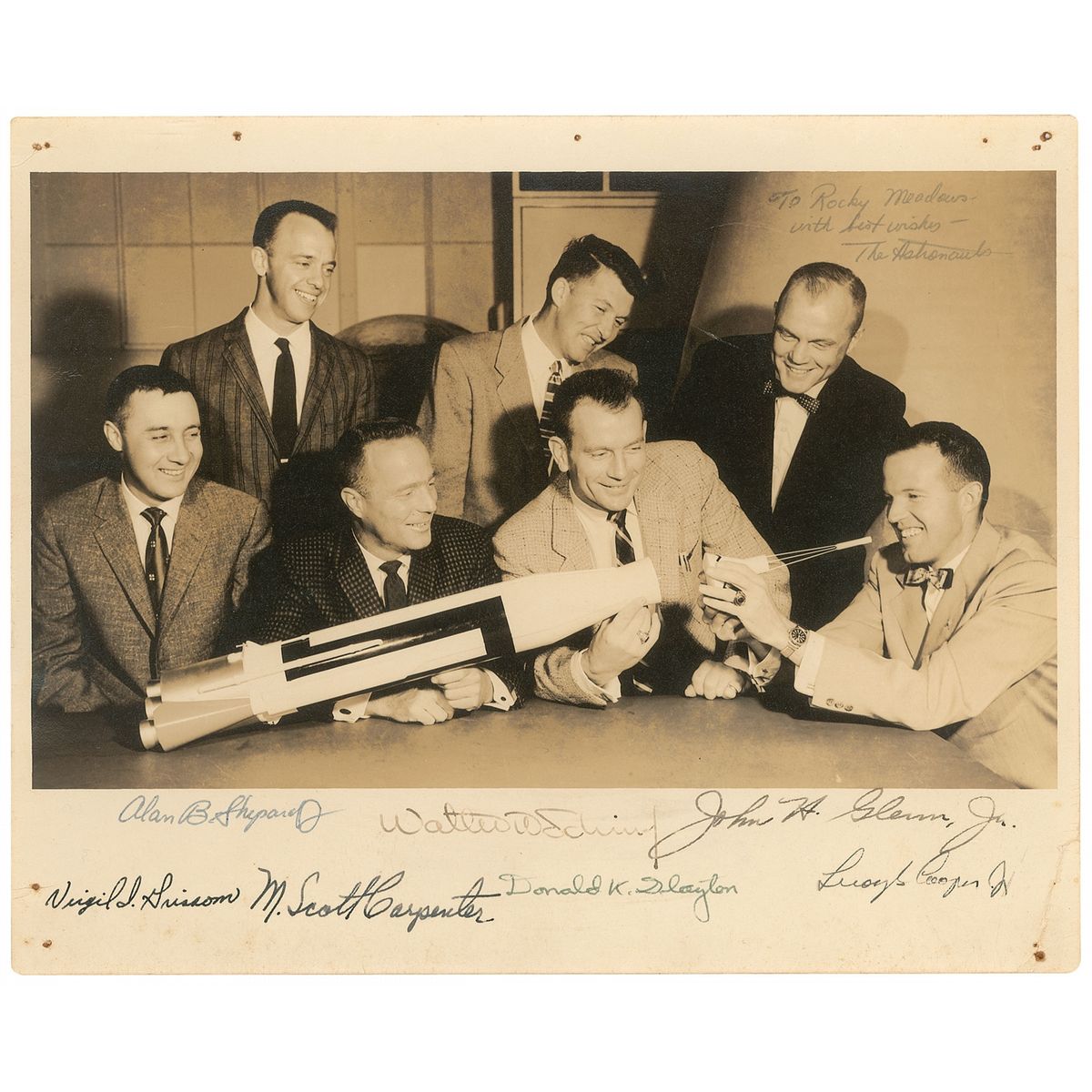 Vintage matte-finish 10 x 8 photo of the Mercury astronauts posing with a model of their space craft, signed in the lower border in blue and black ink by all seven astronauts using their more ‘formal’ signatures: “Alan B. Shepard, Jr.,” “Virgil I. Grissom,” “M. Scott Carpenter,” “Walter M. Schirra, Jr.,” “Donald K. Slayton,” “John H. Glenn, Jr.,” and “Leroy G. Cooper, Jr.” Photo is also inscribed in the upper right corner by Alan Shepard, “To Rocky Meadows, with best wishes—The Astronauts.” In very good condition, with tack holes to corners and along top edge, a few creases to borders, Schirra’s signature a shade light, and some rippling along left edge. Accompanied by a letter of provenance from the original recipient which states the signatures were obtained during a visit from the astronauts at his house for his birthday on April 22, 1961. They were stationed at Langley Field under the direction of Cliff Nelson at the time, who happened to be best friends with the parents of the recipient. A very desirable portrait boasting superb provenance.