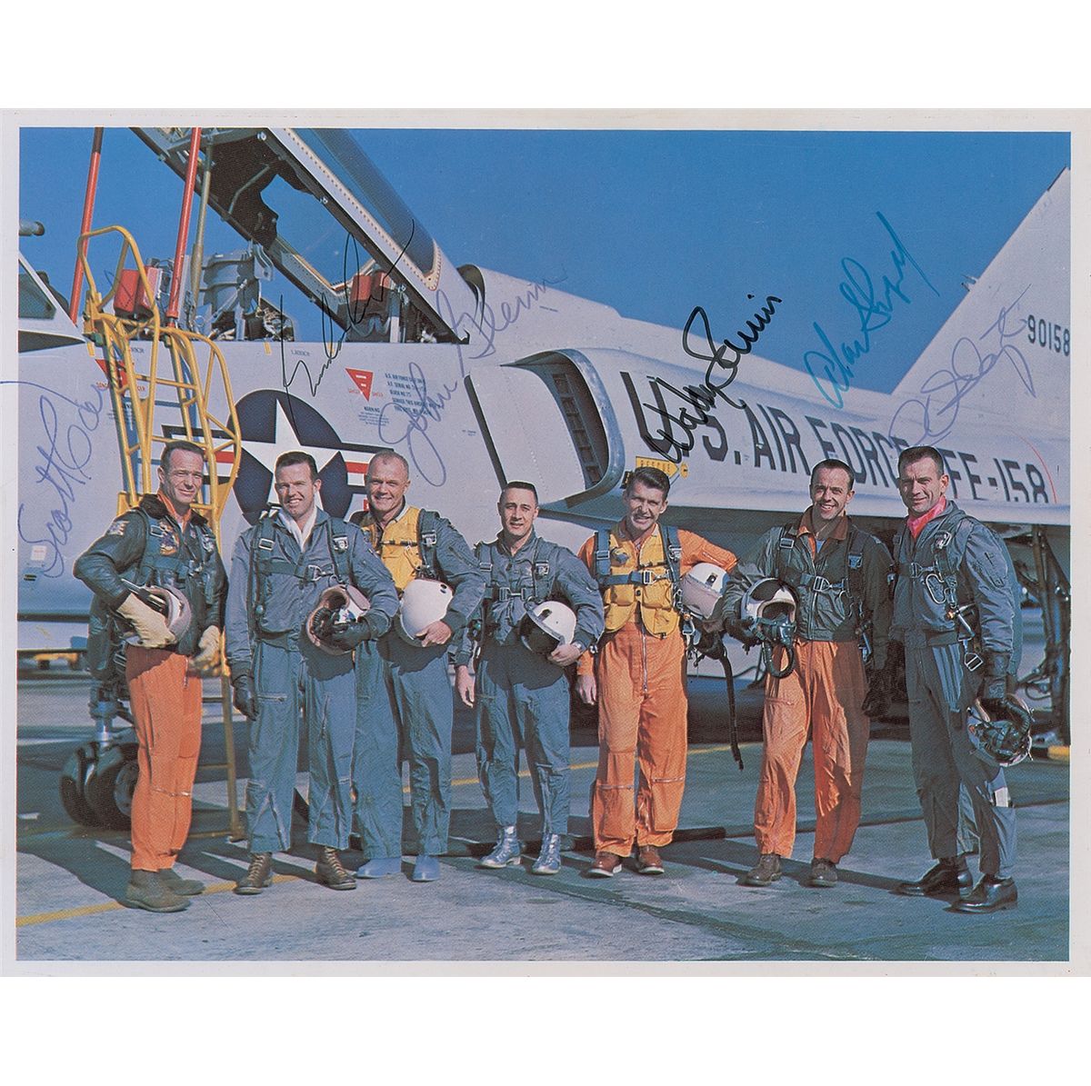 Official color 8 x 10 NASA lithograph of the Mercury astronauts posing in front of an Air Force jet at Langley on January 20, 1961, signed in felt tip and ink by Scott Carpenter, Gordon Cooper, John Glenn, Wally Schirra, Alan Shepard, and Deke Slayton. In fine condition, with some light contrast to end of Carpenter’s signature.