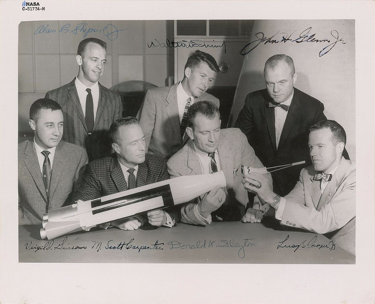 Exceptional official glossy 10 x 8 NASA photo of the Mercury 7 astronauts looking at a model rocket, signed in black ink or fountain pen, “Walter M. Schirra, Jr.,” “John H. Glenn, Jr.,” “Virgil I. Grissom,” “M. Scott Carpenter,” and “Leroy G. Cooper, Jr.,” and in ballpoint, “Alan B. Shepard” and “Donald K. Slayton.” Reverse bears ink ownership notations. In fine condition, with scattered light creasing, primarily to the top border, and Glenn retracing his ballpoint signature with a fountain pen. A sought-after, uninscribed, and fully signed photo of America’s original seven astronauts.