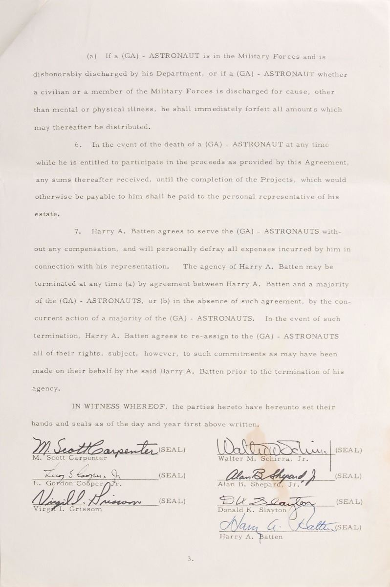 DS, four pages, 8.5 x 13, October 8, 1965. Contract in which Scott Carpenter, Gordon Cooper, Gus Grissom, Wally Schirra, Alan Shepard, and Deke Slayton agree to "appoint Harry A. Batten to represent them in the sale of the rights they may have arising" from Gemini, Apollo, and other space projects. Signed at the bottom of the third page in black ink or felt tip, "M. Scott Carpenter," "Leroy S. Cooper, Jr.," "Virgil I. Grissom," "Walter M. Schirra, Jr.," "Alan B. Shepard, Jr.," and "D. K. Slayton," and countersigned in blue ballpoint by Batten. The final page of the contract is signed in blue or black ink by the wives of the six referenced astronauts, and a transmittal letter forwarding the agreement is stapled to the front page of the document. In fine condition. Akin to Leo De Orsey and the Mercury Project, Philadelphian lawyer and advertising man Harry Batten represented astronauts from NASA's lauded second group, the New Nine, hand-selected for the upcoming Gemini program. And again like De Orsey, Batten helped the new astronauts land a major publishing deal with Life Magazine soon thereafter. An historic, immensely appealing cast of early signatures. Pre-certified Zarelli Space Authentication.