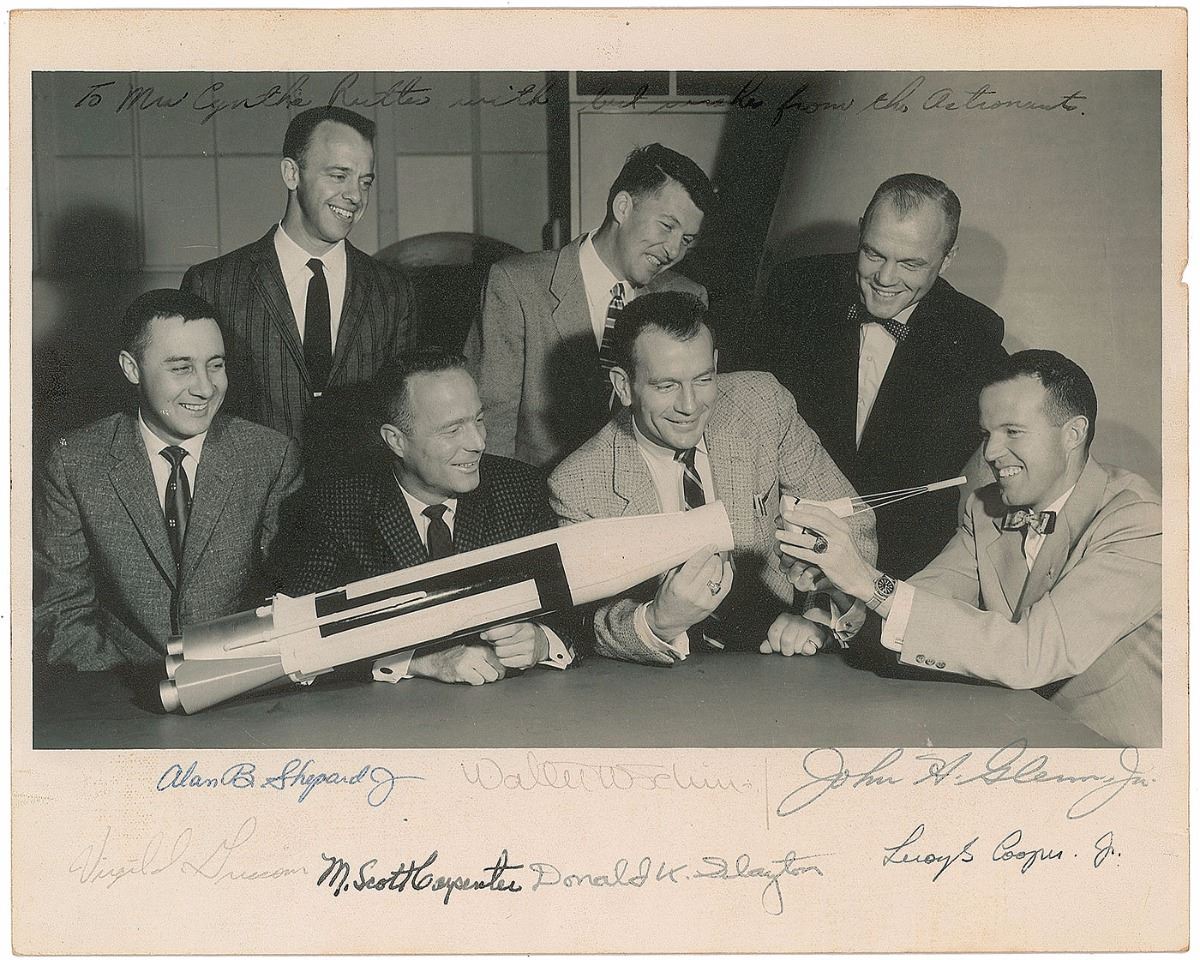 Magnificent matte-finish 10 x 8 photo of the Mercury 7 astronauts admiring a model rocket, inscribed along the top in ink, "To Mrs. Cynthia Rutter with best wishes from the Astronauts," and signed in the lower border in ink or ballpoint, "Leroy S. Cooper, Jr.,” “Alan B. Shepard, Jr.,” “Walter M. Schirra, Jr.,” “John H. Glenn, Jr.,” “Virgil I. Grissom,” “M. Scott Carpenter,” and “Donald K. Slayton.” In fine condition, with a small chip to the right border and the Grissom and Schirra signatures a bit faded but still easily readable. A wonderful fully signed image of America's first astronauts.