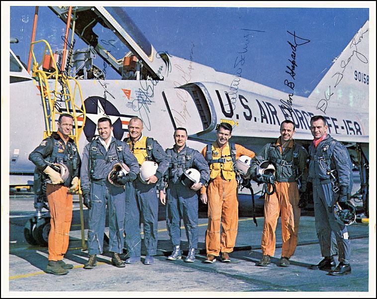 Color vintage 10 x 8 photo of the Mercury astronauts posing in front of an Air Force jet at Langley on January 20, 1961, signed vertically in ink and ballpoint, "M. Scott Carpenter," "Leroy G. Cooper," "J. H. Glenn, Jr.," "Virgil I. Grissom," and "Walter M. Schirra." Photo also bears a secretarial Alan Shepard signature and an autopen signature of Deke Slayton. Matted and framed to an overall size of 16 x 13. Grissom's signature a shade light, and some mild contrast to a couple other signatures, otherwise fine condition.