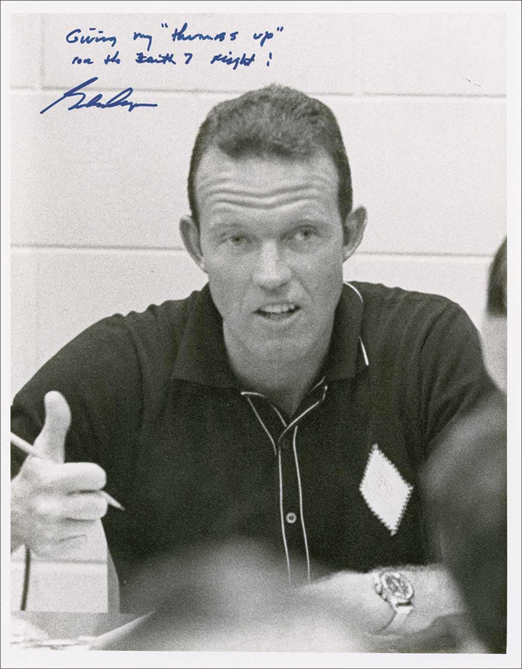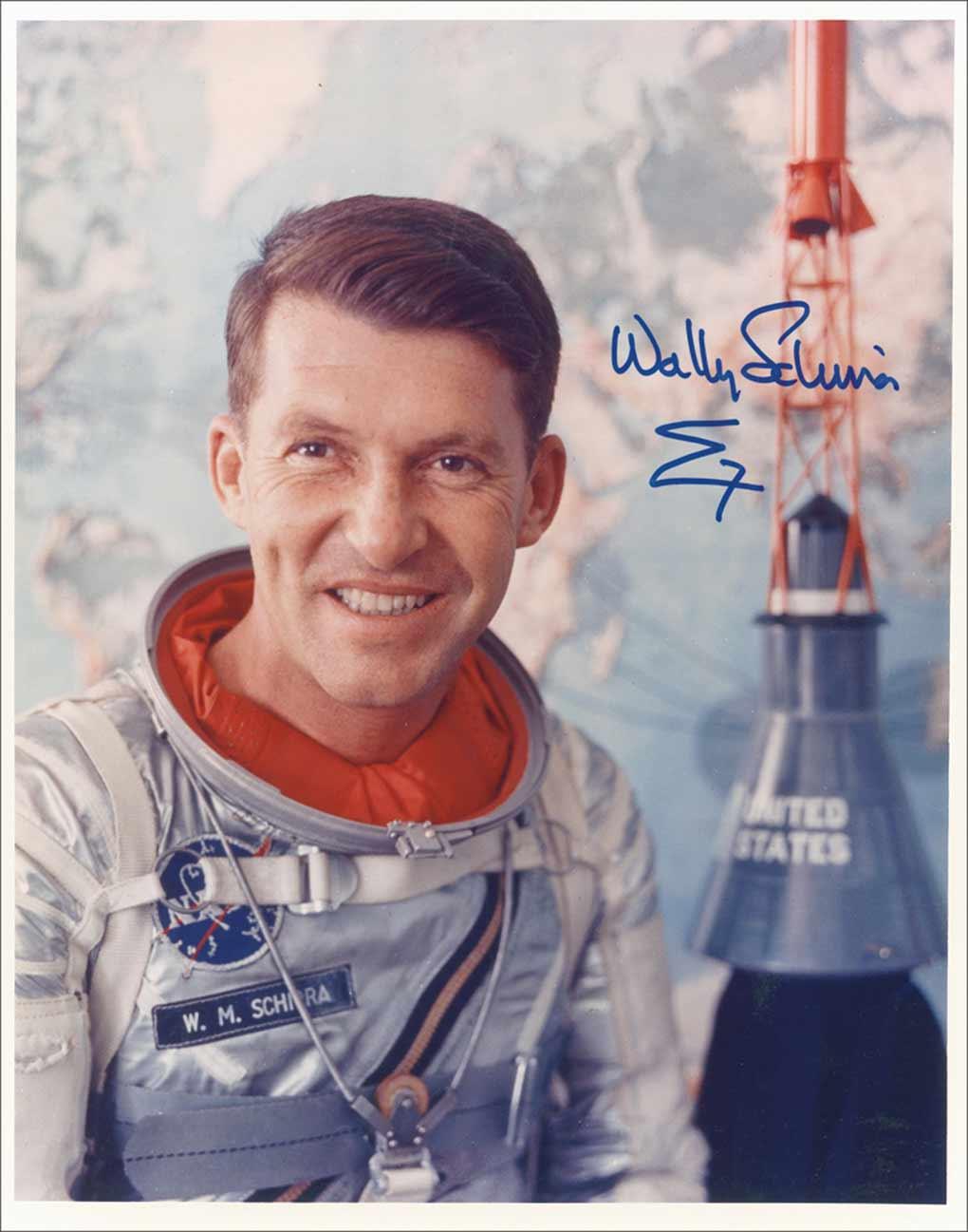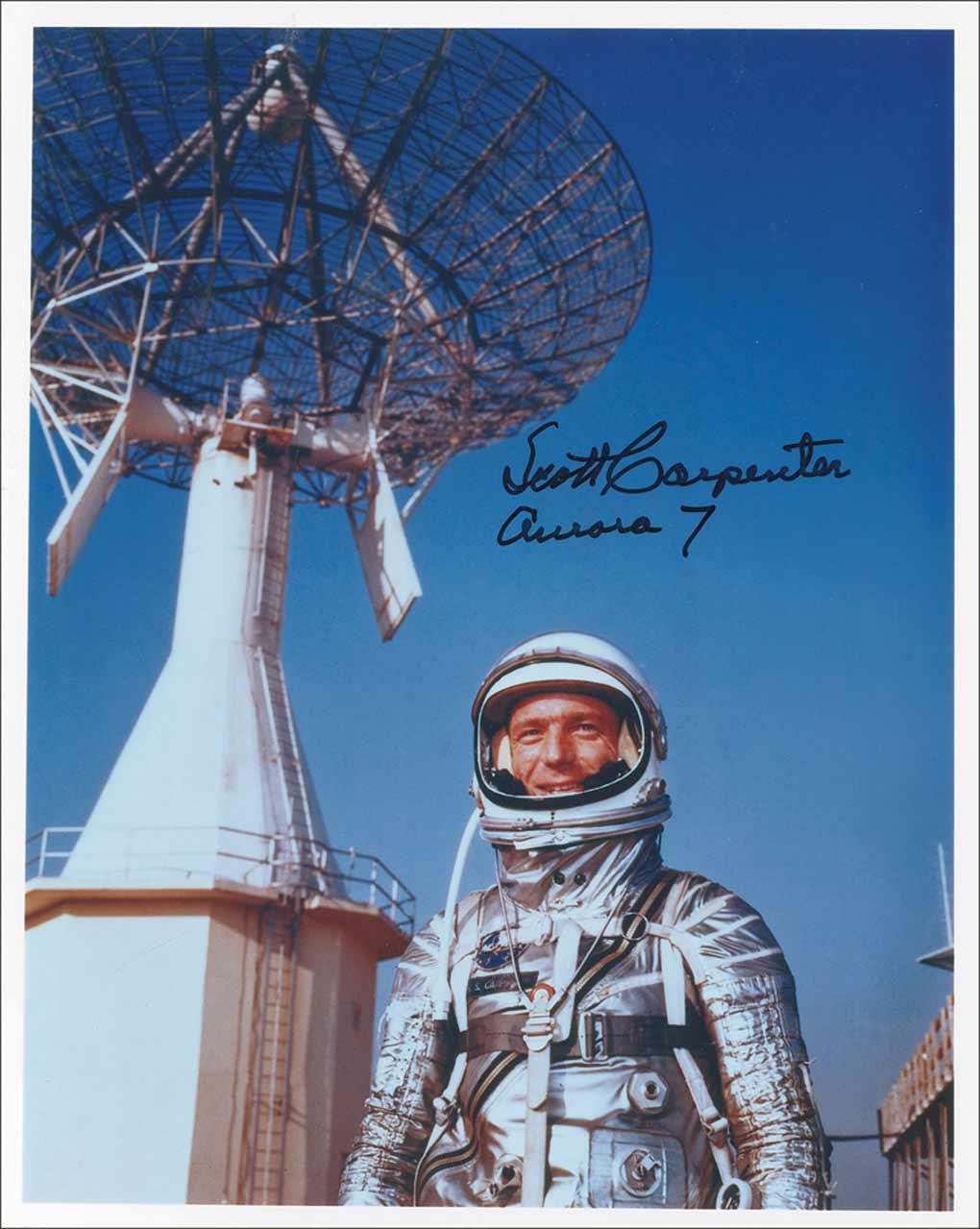 Complete set of signed photos of all seven Mercury astronauts. Photos are as follows: color 8 x 10 NASA photo of Gus Grissom, signed and inscribed in black felt tip; glossy 8 x 10 photo of Alan Shepard being hoisted from his capsule after splashdown, signed in black felt tip; glossy 8 x 10 NASA photo of Gordon Cooper before the flight of Friendship 7, signed in blue felt tip, “Giving my ‘thumbs up’ for the Faith 7 flight! Gordon Cooper”; color satin-finish 8 x 10 photo of Scott Carpenter in his flight suit, signed in black felt tip; glossy 8 x 10 photo of John Glenn before his flight, signed in black felt tip; and a color NASA 8 x 10 photo of Deke Slayton in his white spacesuit, signed and inscribed in black ink. Accompanied by an unsigned color 10 x 8 photo of all seven astronauts posing on the flight deck of an aircraft carrier. In fine overall condition.
