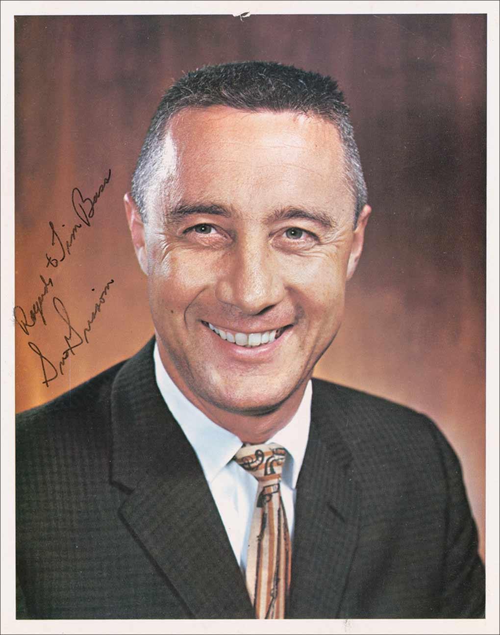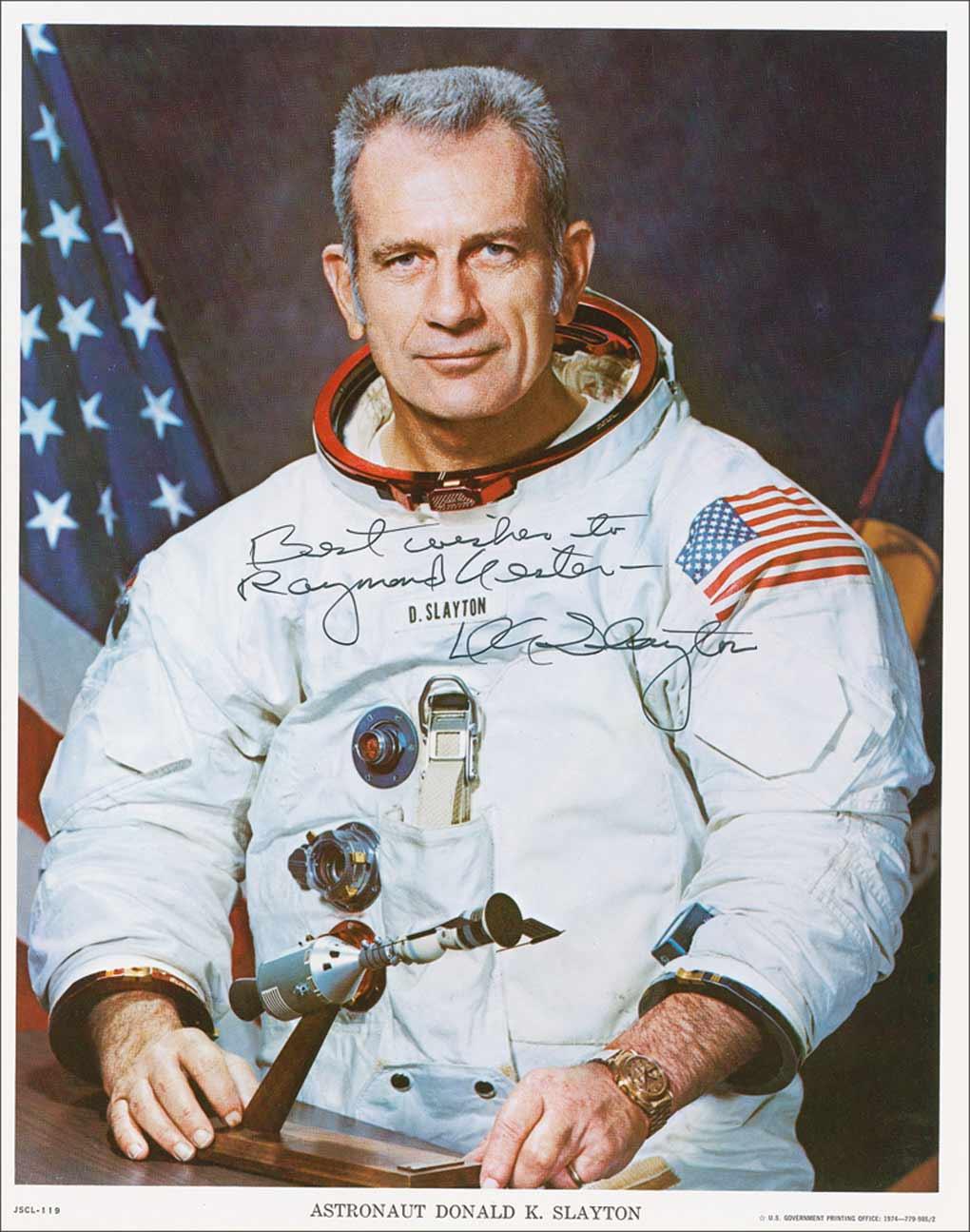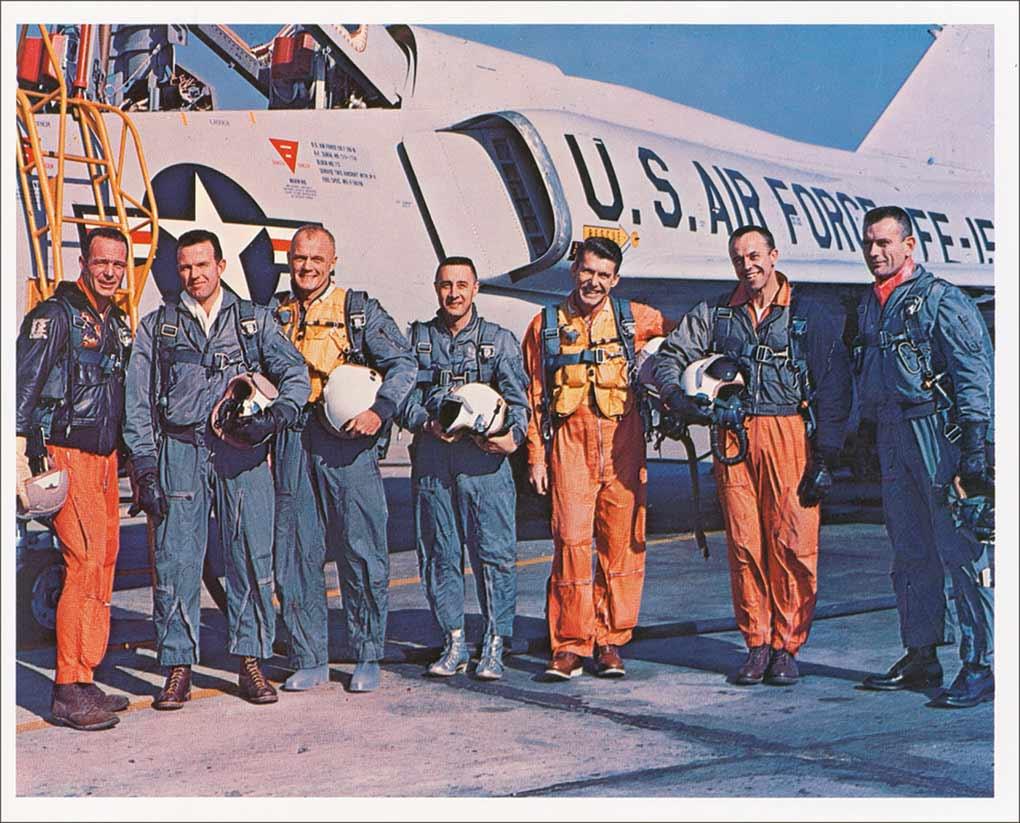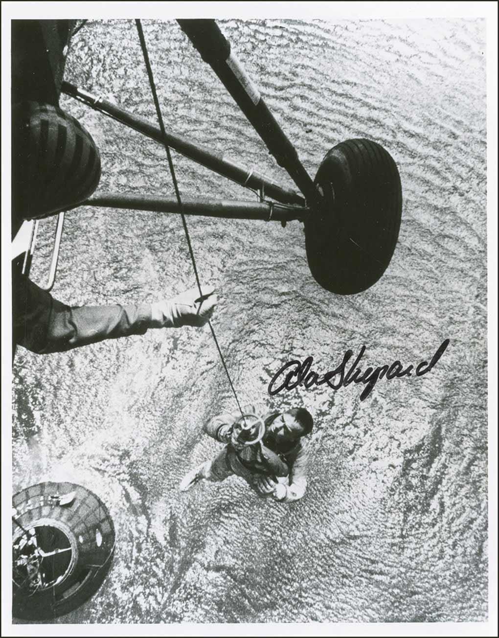 Complete set of signed photos of all seven Mercury astronauts. Photos are as follows: color 8 x 10 NASA photo of Gus Grissom, signed and inscribed in black felt tip; glossy 8 x 10 photo of Alan Shepard being hoisted from his capsule after splashdown, signed in black felt tip; glossy 8 x 10 NASA photo of Gordon Cooper before the flight of Friendship 7, signed in blue felt tip, “Giving my ‘thumbs up’ for the Faith 7 flight! Gordon Cooper”; color satin-finish 8 x 10 photo of Scott Carpenter in his flight suit, signed in black felt tip; glossy 8 x 10 photo of John Glenn before his flight, signed in black felt tip; and a color NASA 8 x 10 photo of Deke Slayton in his white spacesuit, signed and inscribed in black ink. Accompanied by an unsigned color 10 x 8 photo of all seven astronauts posing on the flight deck of an aircraft carrier. In fine overall condition.
