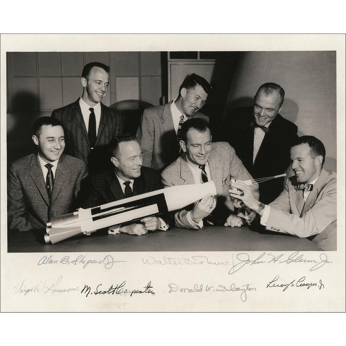 Vintage matte-finish 10 x 8 photo of the Mercury 7 astronauts with a model of a rocket, signed in various inks “Alan B. Shepard, Jr.,” “Walter M. Schirra, Jr.,” “John H. Glenn, Jr.,” “Virgil I. Grissom,” “M. Scott Carpenter,” “Donald K. Slayton,” and “Leroy S. Cooper, Jr.” A subtle shade of fading to signatures (all of which are nonetheless clear), slightly irregular adhesion to Grissom’s and Carpenter’s signatures (slight smudging to Carpenter), and mild rippling to left edge, otherwise fine condition.