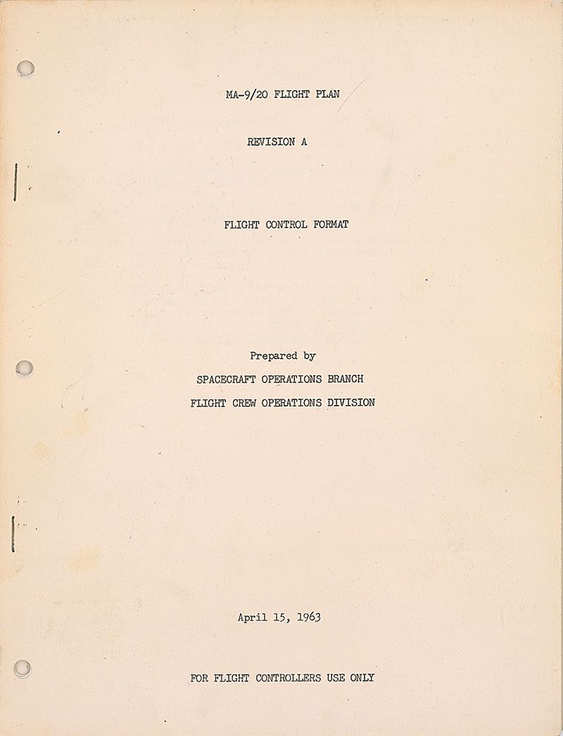 Scarce printed flight plan, titled “MA-9/20 Flight Plan, Revision A, Flight Control Format,” dated April 15, 1963, 8 x 10.5, 19 pages, bound by two staples to the left edge. Inside has a time line from the time of launch to splashdown after 22 orbits. Accompanied by a copy of a memo forwarding the revised copy. In fine condition, with some scattered light toning. The first such copy we have encountered.