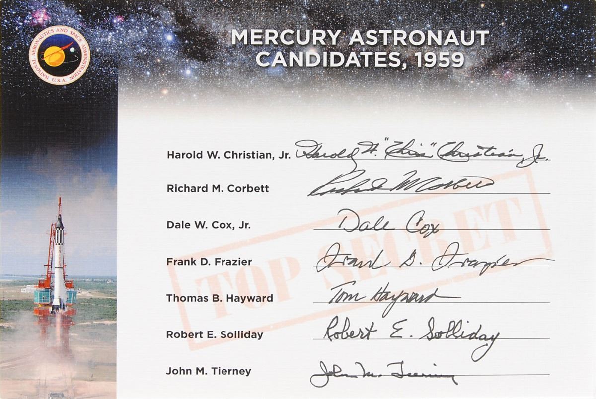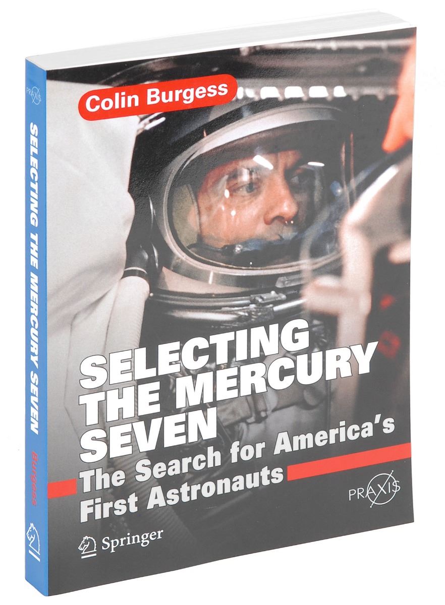 Signed book: Selecting the Mercury Seven. Chichseter, UK: Springer-Praxis, 2011. Softcover, 6.75 x 9.5, 371 pages. Signed on the title page in black felt tip by the author, “Colin Burgess, Ad Astra!” An included 9.25 x 6.25 insert is signed in black felt tip by original astronaut candidates Harold W. Christian, Jr., Richard M. Corbett, Dale W. Cox, Jr., Frank D. Frazier, Thomas B. Hayward, Robert E. Solliday, and John M. Tierney. In fine condition.
