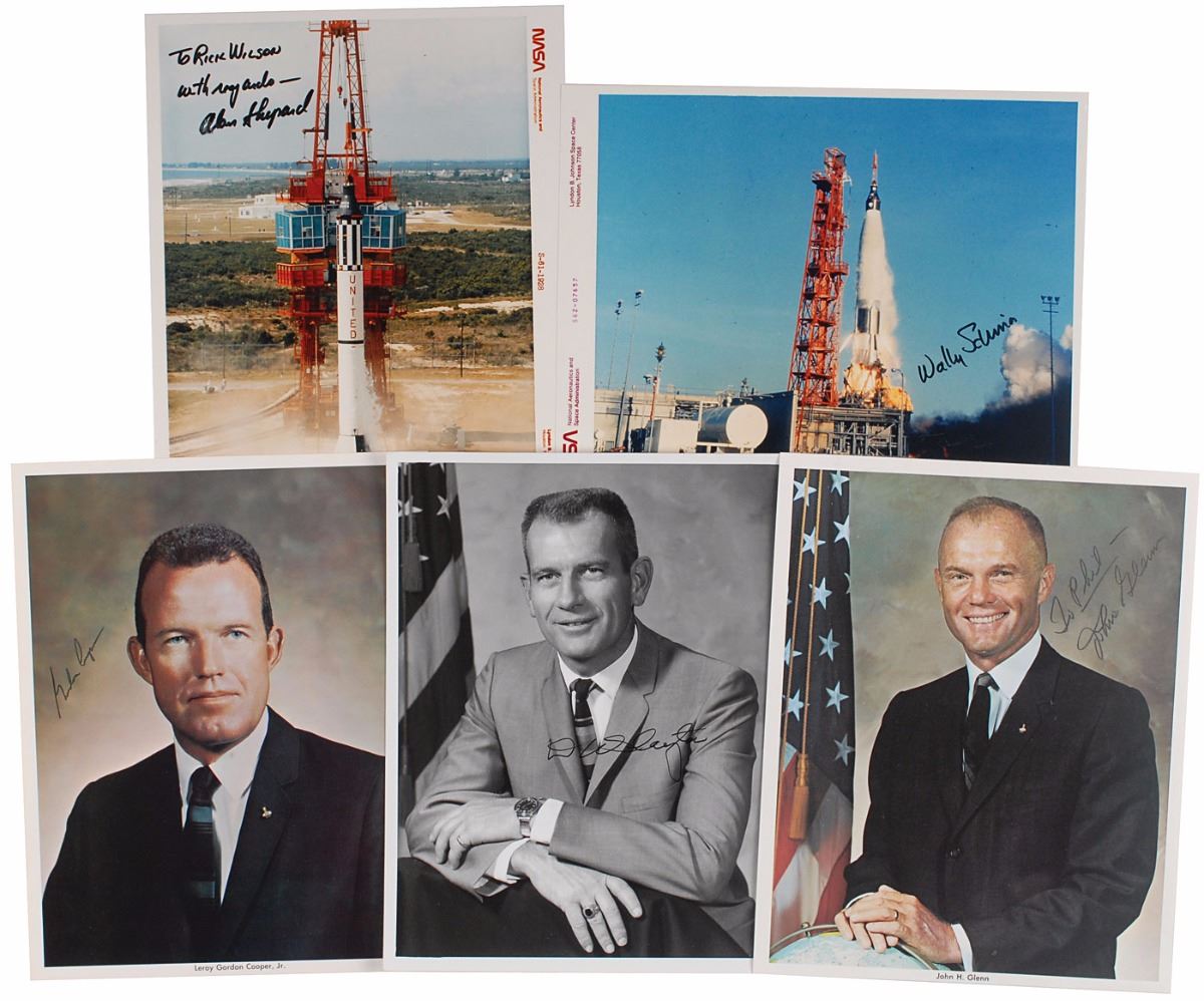 Desirable set of five official NASA photos and lithographs, two of which are of the ‘red–numbered’ variety, 8 x 10 and 10 x 8, individually signed and inscribed in black ink and felt tip by a Mercury astronaut, including: Gordon Cooper, Wally Schirra, John Glenn (ins), Deke Slayton, and Alan Shepard (ins). In overall fine condition, with three horizontal bends to the Cooper (one touching a portion of his last name), slight brushing to the first letter of the Shepard signature, and slight irregular ink adhesion to the Glenn signature.