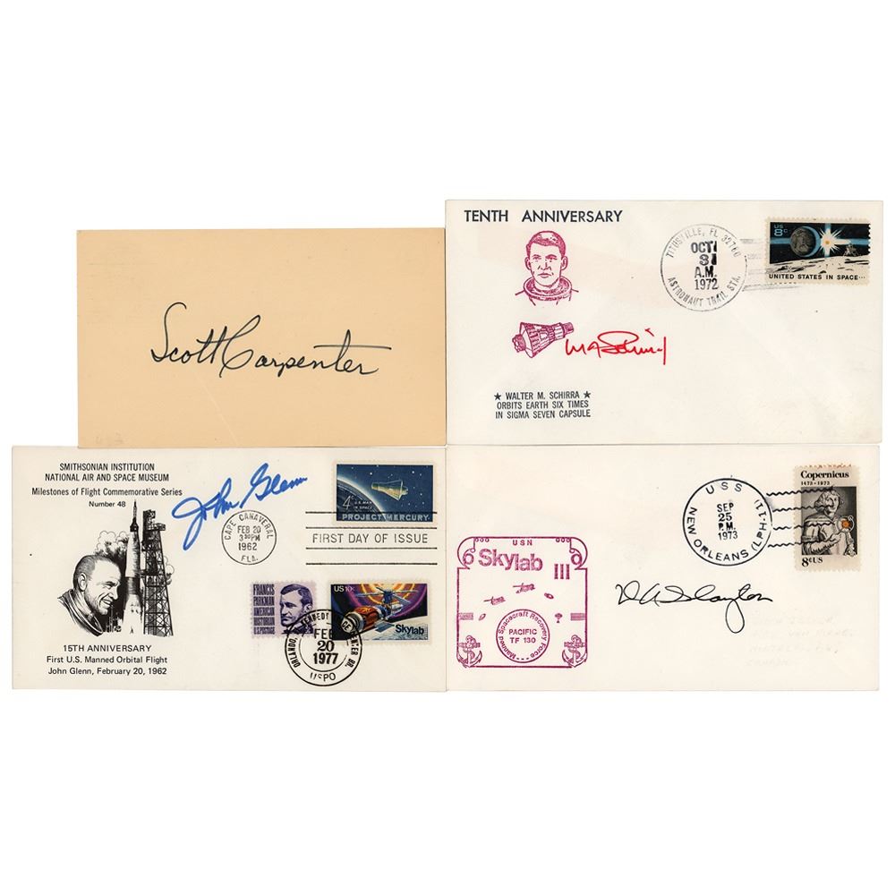 Four items signed by members of the first group of NASA astronauts, including three commemorative covers and a postcard. Signers are: John Glenn, Scott Carpenter, Wally Schirra, and Deke Slayton. In overall very good to fine condition, with a diagonal crease to the Carpenter card.