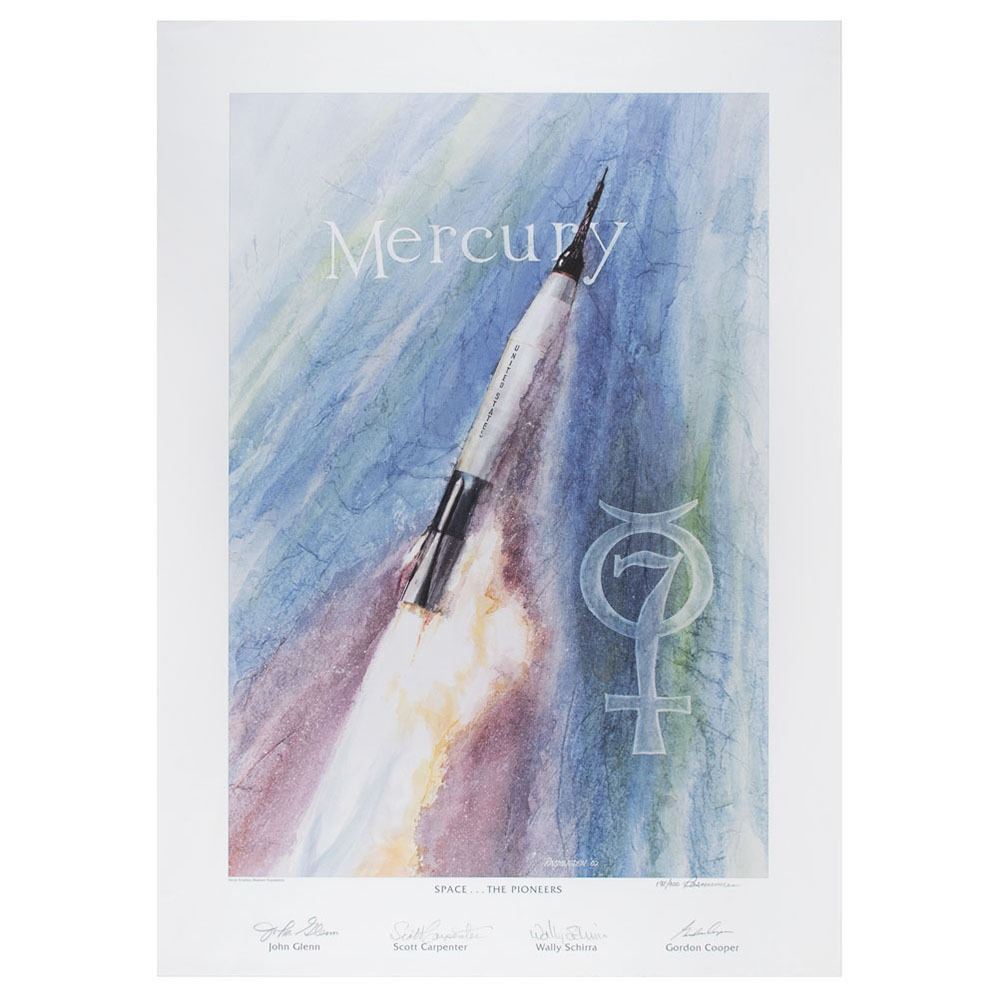 Limited edition color 21 x 29.25 lithograph of R. L. Rasmussen’s watercolor of a Mercury rocket entitled ‘Space…The Pioneers,’ numbered 198/300, signed in the lower border in pencil by the first four Americans to orbit Earth: John Glenn, Scott Carpenter, Wally Schirra, and Gordon Cooper. Also signed by the artist. Rolled and in fine condition. Accompanied by a certificate of authenticity from the National Aviation Museum Foundation.