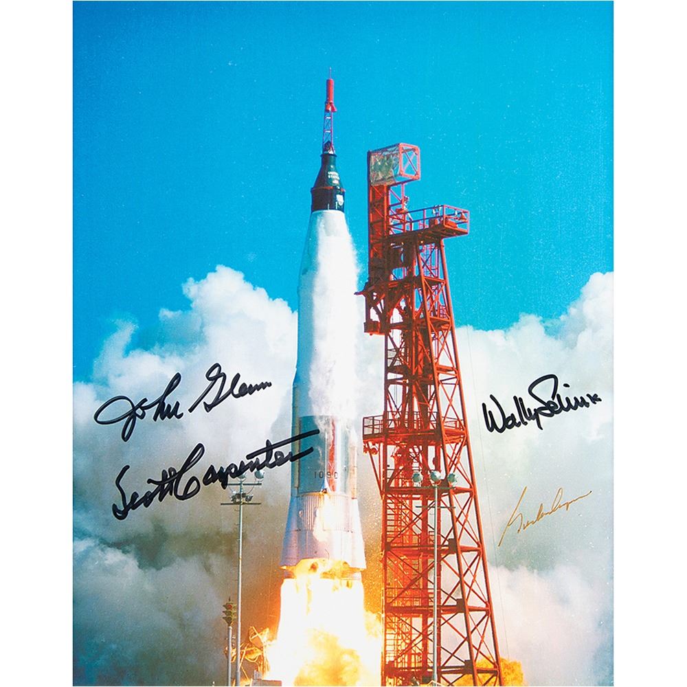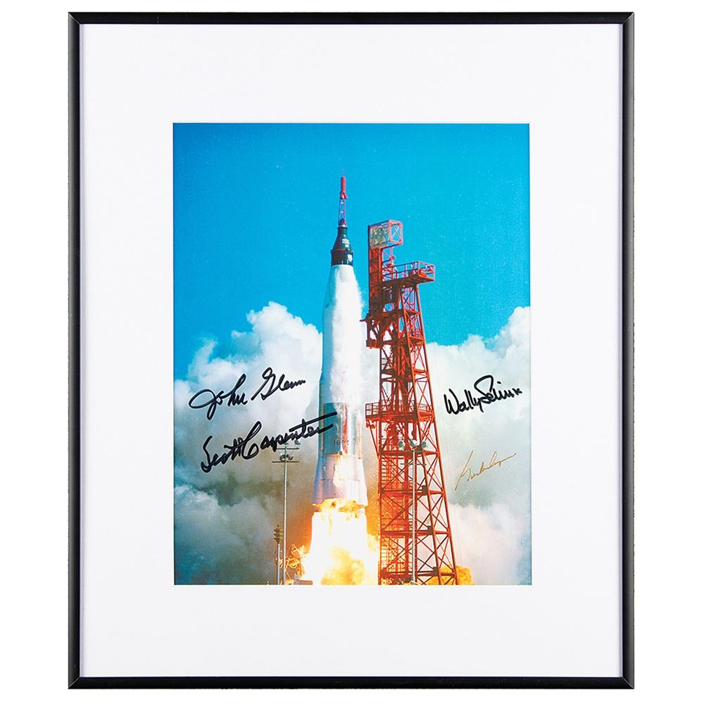 Color glossy 8.25 x 10.5 photo of an Atlas LV-3B rocket launching the Mercury-Atlas 6 mission on February 20, 1962, signed in black felt tip by John Glenn, Scott Carpenter, and Wally Schirra, and in black ink by Gordon Cooper. Matted and framed to an overall size of 13.25 x 15.5. In very fine condition. Accompanied by a certificate of authenticity from Howard Benedict of the Astronaut Scholarship Foundation.