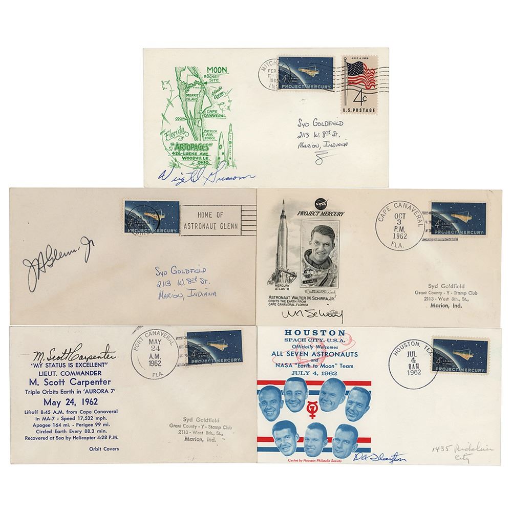 Group lot of five vintage covers and envelopes, each postmarked between 1962 and 1968, individually signed in ink by one of the original Mercury astronauts, including: “M. Scott Carpenter,†“J. H. Glenn, Jr.,†“Virgil I. Grissom,†“W. M. Schirra, Jr.,†and “D. K. Slayton.†Includes a cover signed by Shorty Powers, an American public affairs officer for NASA during Project Mercury, who was known as the "voice of Mercury Control.†In overall fine condition.