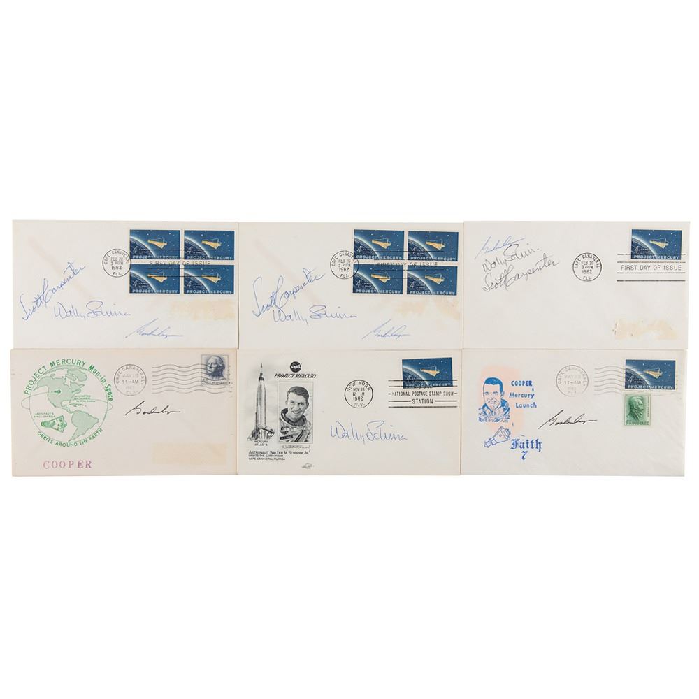 Six covers signed by Mercury astronauts: three multi-signed Project Mercury FDCs, each signed in ballpoint by Scott Carpenter, Wally Schirra, and Gordon Cooper; a commemorative cover honoring Wally Schirra's Mercury-Atlas 8 flight, signed in blue ballpoint by Schirra; and two Mercury-Atlas 9 launch day covers, each signed in blue felt tip by Gordon Cooper. In overall very good to fine condition, with light bands of toning and removed address labels to the multi-signed covers.