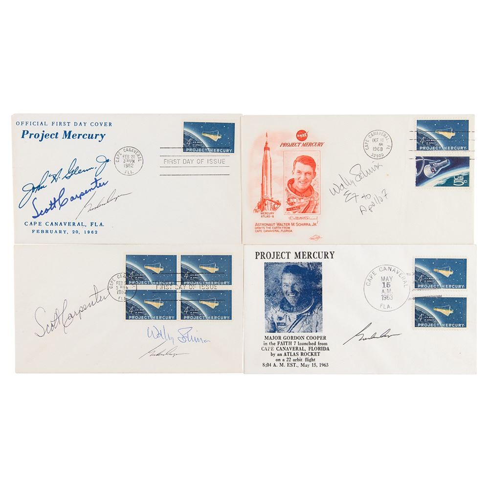 Nice collection of four covers honoring Project Mercury, each signed by one or more of the Mercury astronauts. Includes: a first day cover with a block of Project Mercury stamps, signed in ballpoint by Scott Carpenter, Wally Schirra, and Gordon Cooper; a first day cover honoring John Glenn's historic MA-6 orbital flight, featuring Glenn's facsimile signature, signed in ink by Scott Carpenter and Gordon Cooper; a cover honoring Mercury-Atlas 8, signed in black ballpoint by Wally Schirra, who adds: "Sigma 7 to Apollo 7"; and a Mercury-Atlas 9 launch day cover, signed in black felt tip by Gordon Cooper. In overall very fine condition.