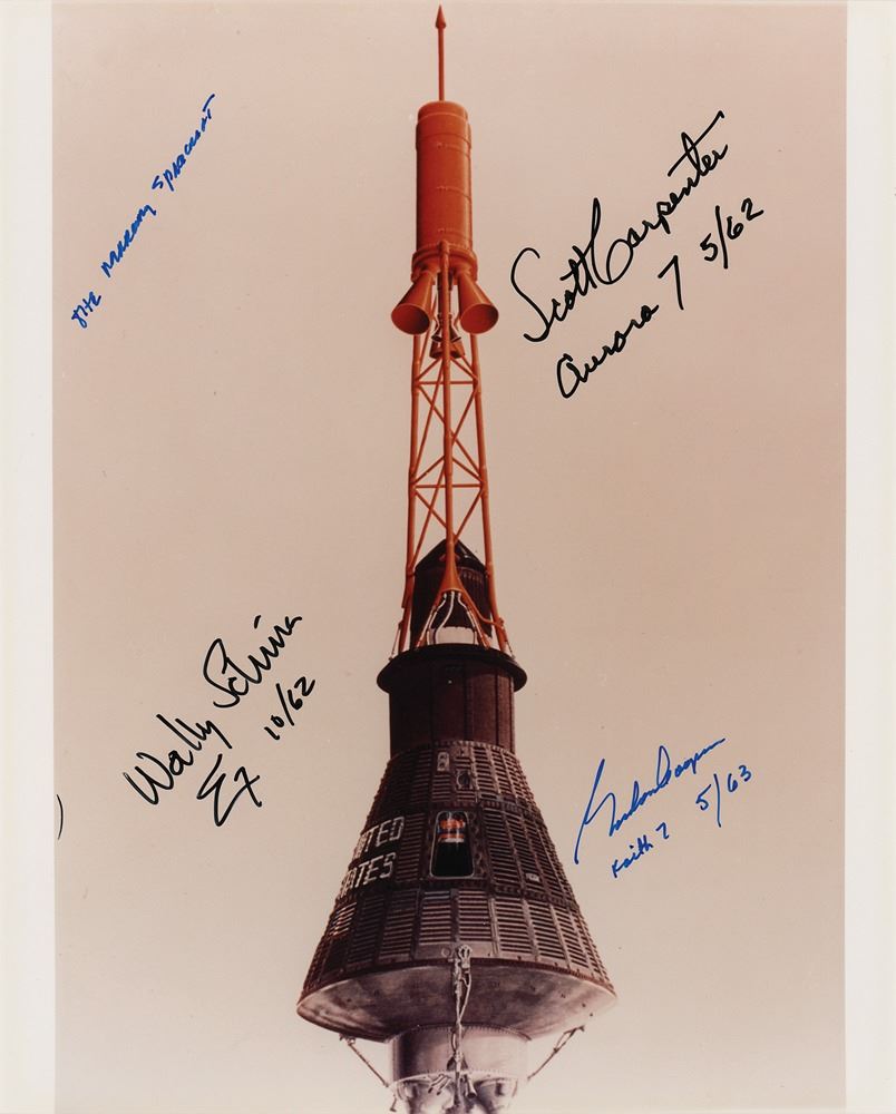 Color satin-finish 8 x 10 photo of the Mercury capsule with escape tower attached, signed in blue and black felt tip, "Scott Carpenter, Aurora 7, 5/62," "Wally Schirra, Sigma 7, 10/62," and "The Mercury Spacecraft, Gordon Cooper, Faith 7, 5/63." In very fine condition.