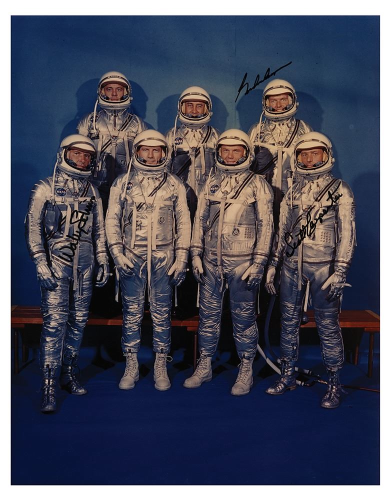 Color satin-finish 11 x 14 photo of the Mercury Seven in their silver space suits, signed in black felt tip, "Wally Schirra," "Gordon Cooper," and "Scott Carpenter." In very fine condition.
