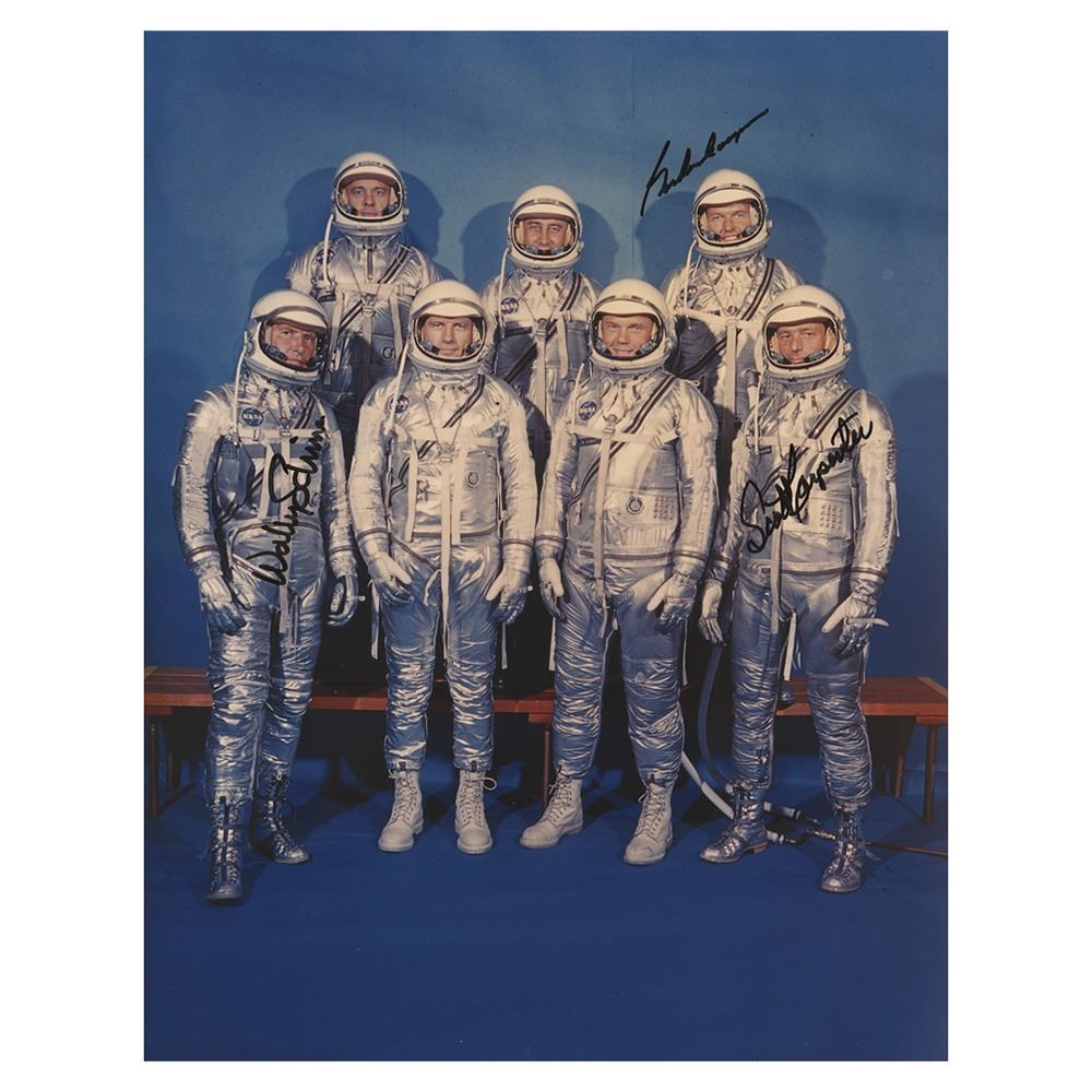 Color semi-glossy 11 x 14 photo of the original seven astronauts of the Mercury Program posing together in their silver space suits, signed in black felt tip by Scott Carpenter, Gordon Cooper, and Wally Schirra. In fine condition.