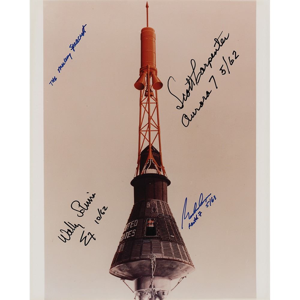 Color satin-finish 8 x 10 photo of the Mercury capsule with escape tower attached, signed in blue and black felt tip, "Scott Carpenter, Aurora 7, 5/62," "Wally Schirra, Sigma 7, 10/62," and "The Mercury Spacecraft, Gordon Cooper, Faith 7, 5/63." In very fine condition.