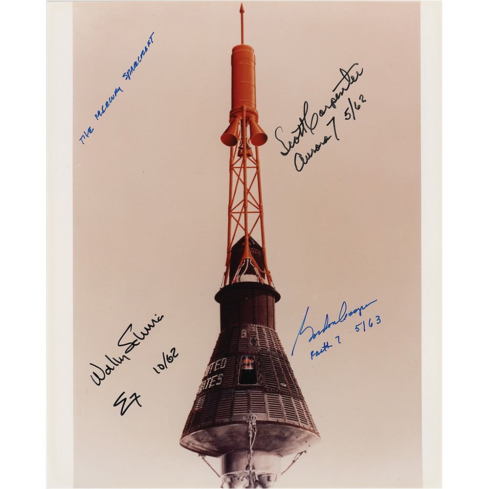 Color satin-finish 8 x 10 photo of the Mercury capsule with escape tower attached, signed in blue and black felt tip, "Scott Carpenter, Aurora 7, 5/62," "Wally Schirra, Sigma 7, 10/62," and "The Mercury Spacecraft, Gordon Cooper, Faith 7, 5/63." In very fine condition.