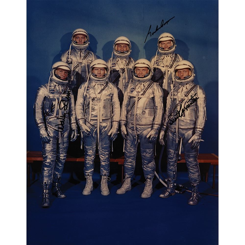 Color satin-finish 11 x 14 photo of the Mercury Seven in their silver space suits, signed in black felt tip, "Wally Schirra," "Gordon Cooper," and "Scott Carpenter." In fine condition.