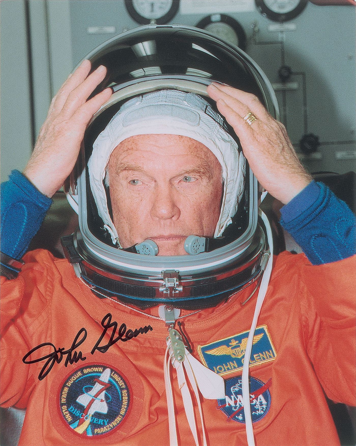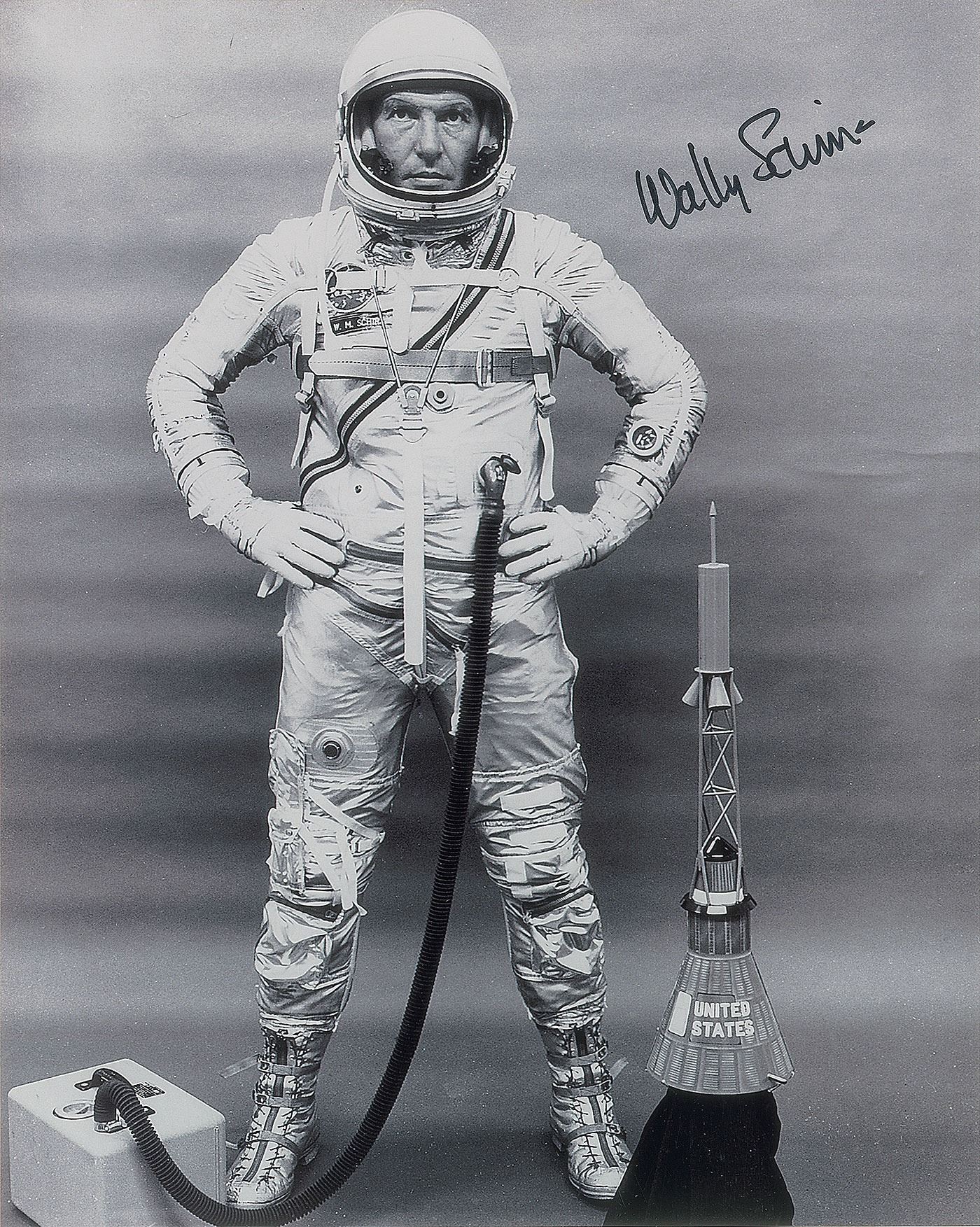 Three photos: a color semi-glossy 8 x 10 photo of John Glenn as a member of the STS-95 crew, signed in black felt tip; a color semi-glossy 10 x 8 photo of Wally Schirra posing in his Mercury space suit in front of a large capsule model, signed in black felt tip; and a semi-glossy 8 x 10 full-length photo of Schirra posing in his Mercury space suit with arms akimbo, signed in black felt tip. Reverse of both Schirra photos bear affixed labels from the Astronaut Scholarship Foundation certifying that the autographs were signed for the organization. In overall fine condition.