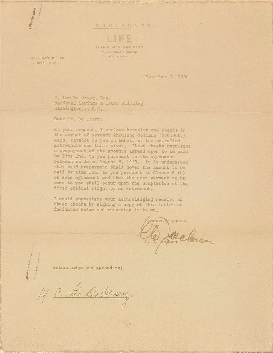 TLS signed “Leo,” one page, 5.5 x 8.5, Law Offices of De Orsey and Thompson letterhead, November 22, 1960. Letter to “the boys” of Project Mercury, in full: “I have asked Life Magazine to move up their 1961 payment. Enclosed is copy of letter I have received from them. I enclose checks for $20,000, being your share of the $140,000 received.” Text along bottom reads, “Copy for each Astronaut.” Includes a duplicate of the referenced letter, directed to Leo De Orsey from Life Magazine’s C. D. Jackson, in part: “I enclose herewith two checks in the amount of seventy thousand dollars…each, payable to you on behalf of the so-called Astronauts and their wives. These checks represent a prepayment of the amounts agreed upon to be paid by Time Inc. to you pursuant to the agreement between us dated August 5, 1959…the next payment to be made to you shall occur upon the completion of the first orbital flight by an Astronaut.” In fine condition. A tax lawyer from Washington and former acting president of the Washington Redskins, De Orsey represented the original seven astronauts pro bono, and was instrumental in landing the group’s exclusive $500,000 contract with Life Magazine, a deal that would introduce the American public to the heroes of Project Mercury. Amounting to around $4 million by today’s standards, the sum was shared evenly between each astronaut, with each man earning just under $24,000 per year over the course of the three years the Project Mercury was scheduled to run. A remarkable letter in which De Orsey distributes the first payment from Life Magazine.
