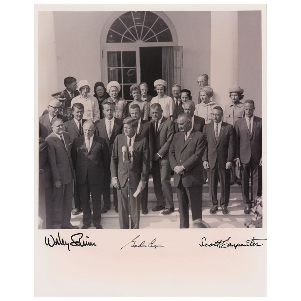 Glossy 8 x 10 photo of the original seven Mercury astronauts standing behind President John F. Kennedy when he presented them with the 1962 Robert J. Collier Trophy in the Rose Garden of the White House on October 10, 1963, signed in the lower border in black felt tip by Wally Schirra, Gordon Cooper, and Scott Carpenter. In fine condition.