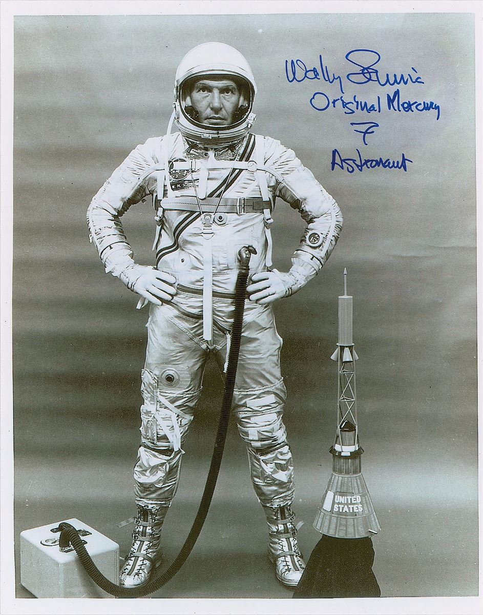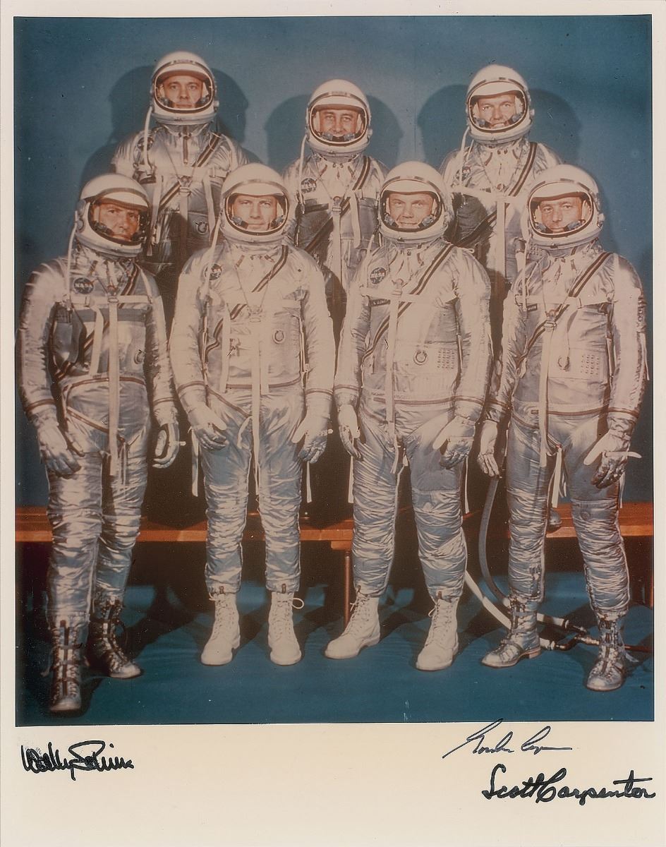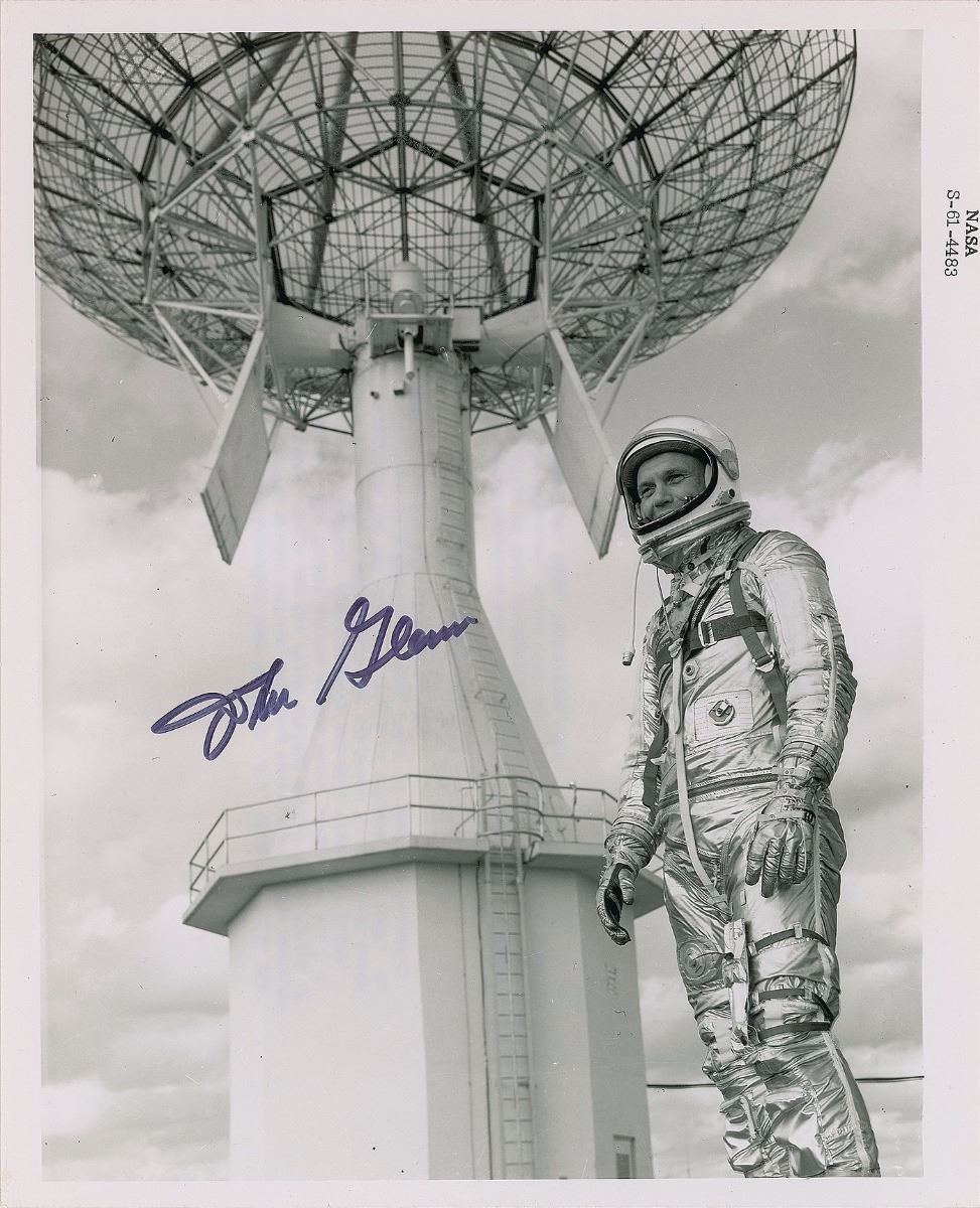 Three photos: a glossy 8 x 10 full-length photo of Schirra in his Mercury spacesuit, signed in blue felt tip, “Wally Schirra, Original Mercury 7 astronaut”; a vintage official glossy 8 x 10 NASA photo of Glenn in his Mercury spacesuit posing in front of a radar dish, signed later in black felt tip, “John Glenn”; and a color glossy 8 x 10 photo of the Mercury 7 astronauts posing in their spacesuits, signed in the lower border in black felt tip, “Gordon Cooper,” “Wally Schirra,” and “Scott Carpenter.” In overall fine condition.
