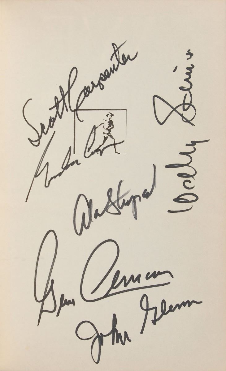 Signed book: We Seven. Book club edition. NY: Simon & Schuster, 1962. Hardcover with dust jacket, 5.75 x 8.5, 473 pages. Signed on an opening page in black felt tip by Scott Carpenter, Alan Shepard, Gordon Cooper, Wally Schirra, John Glenn, and Gene Cernan. In very good to fine condition. Accompanied by two programs for symposiums held in honor of Mercury astronauts in 1995 and 2002 at the Naval Air Station in Pensacola, Florida.